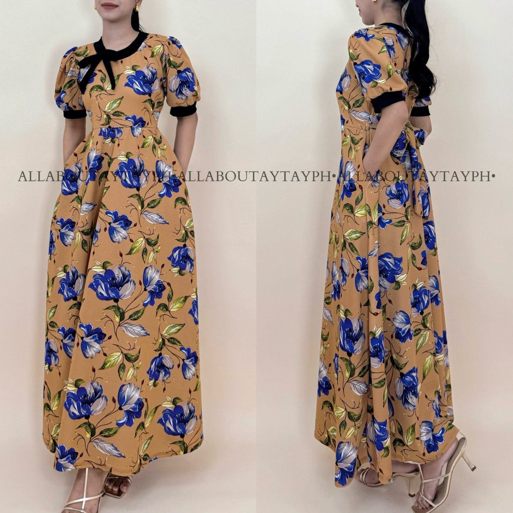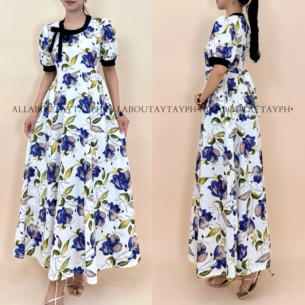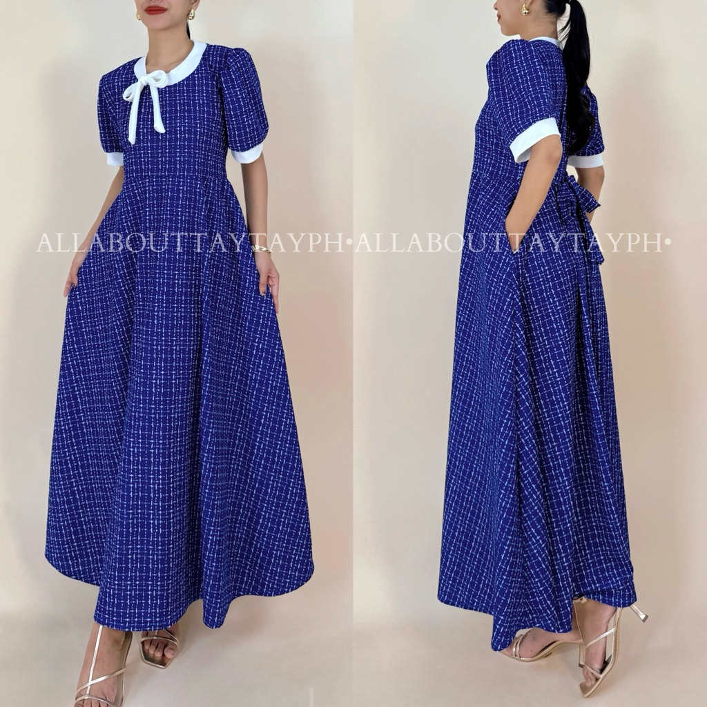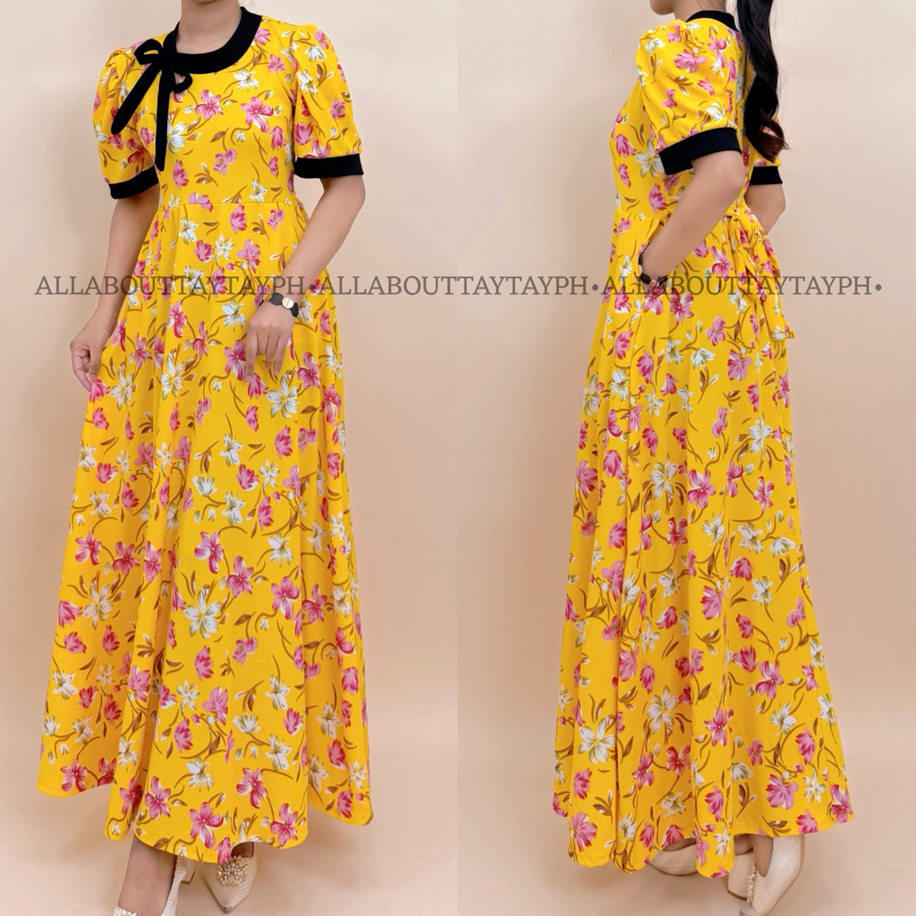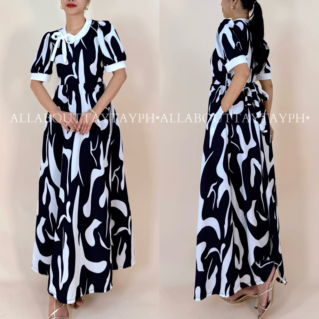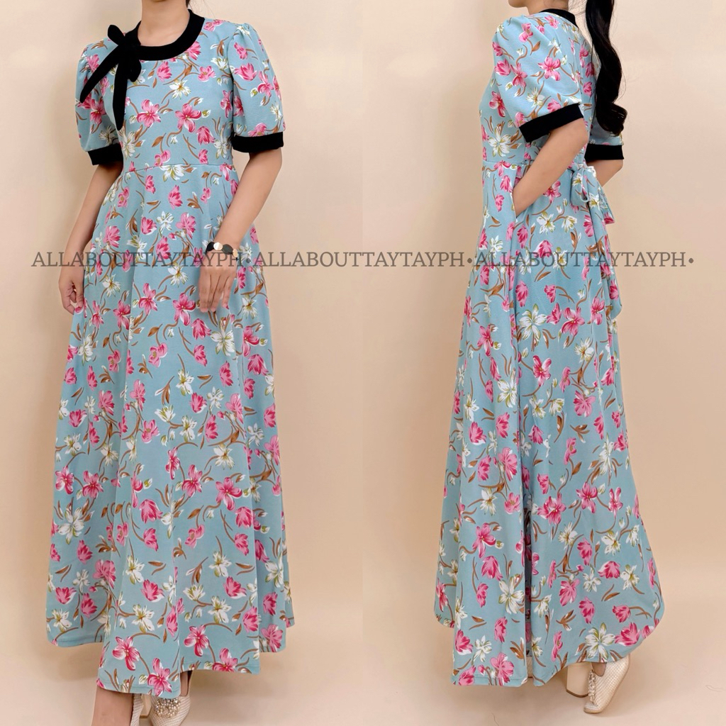 CLAIRE RIBBON TIE COLLAR COMBI CHURCH MAXI DRESS CREPE FABRIC
