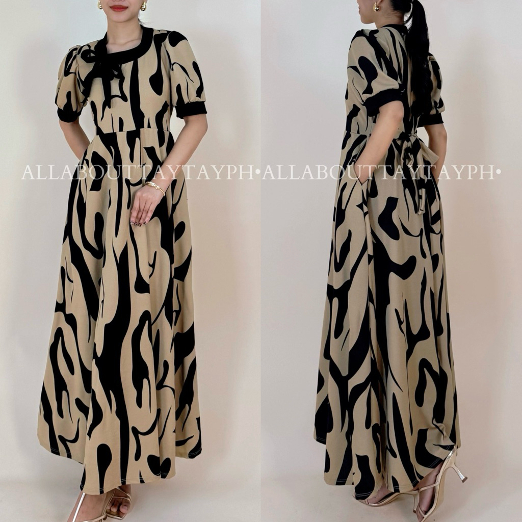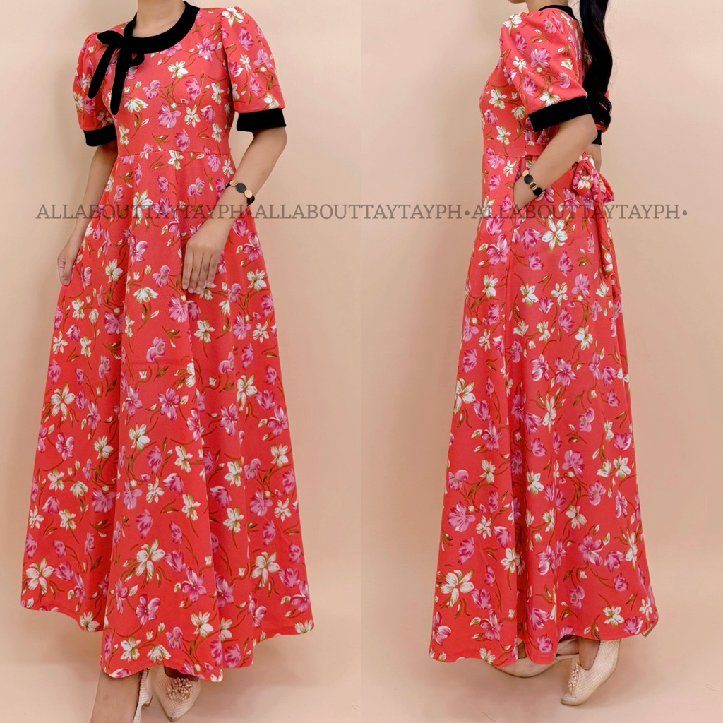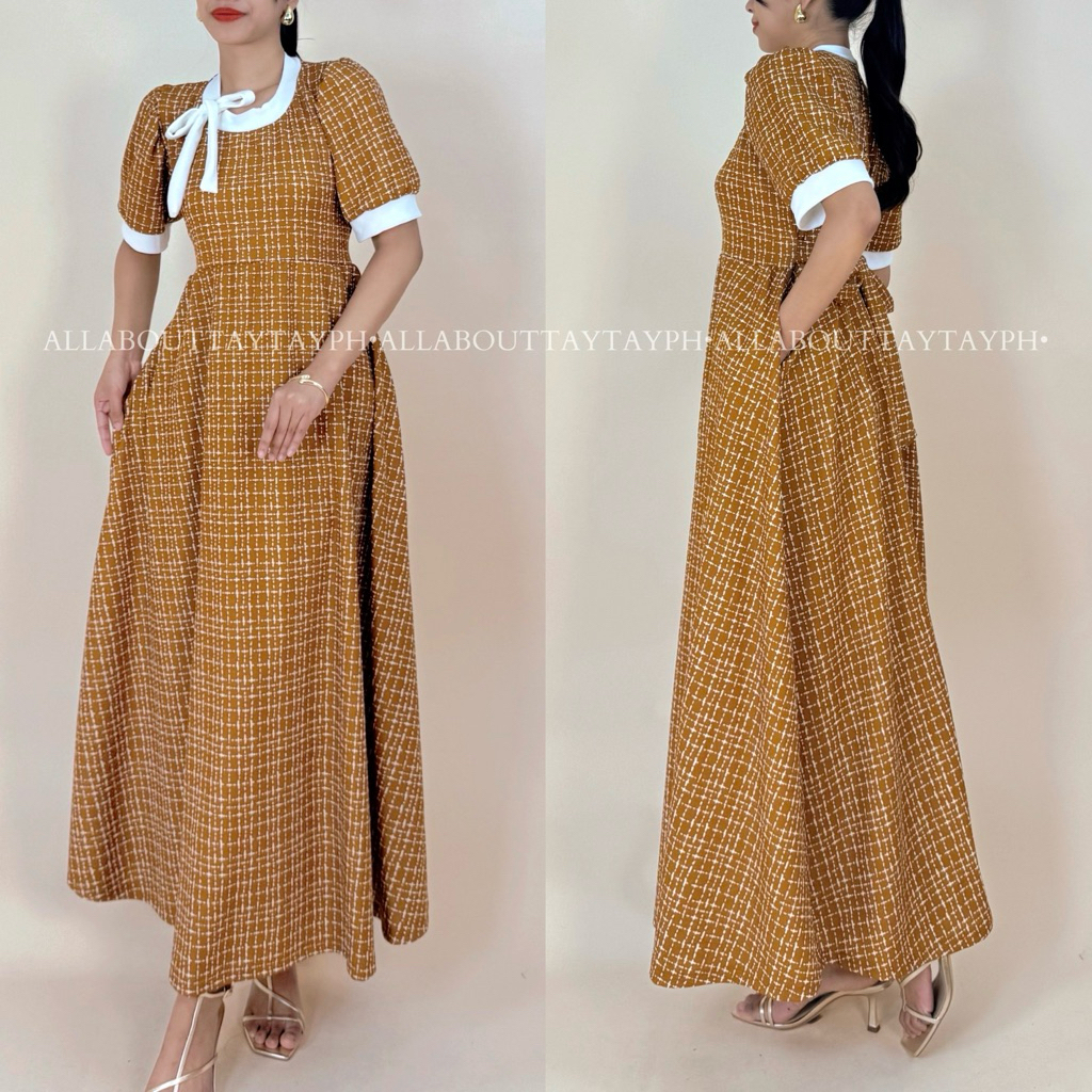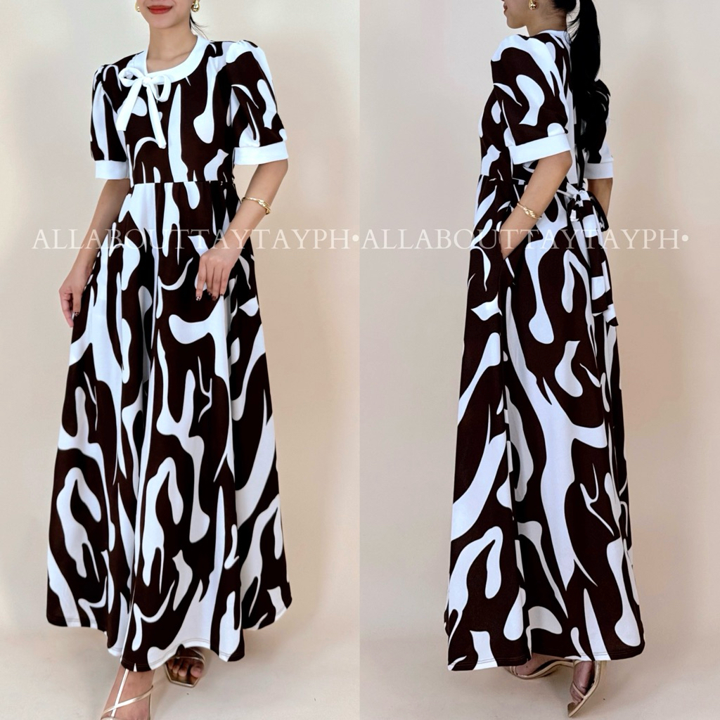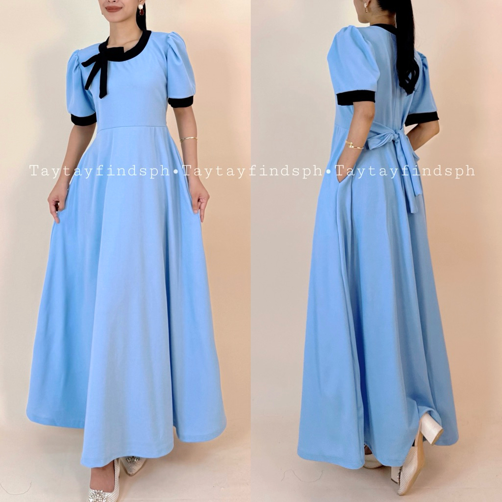 CLAIRE RIBBON TIE COLLAR COMBI CHURCH MAXI DRESS CREPE FABRIC