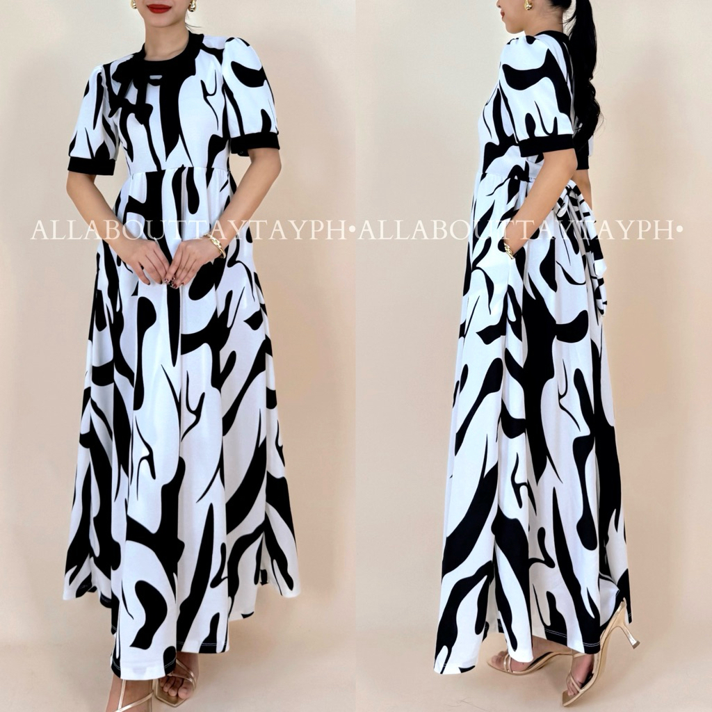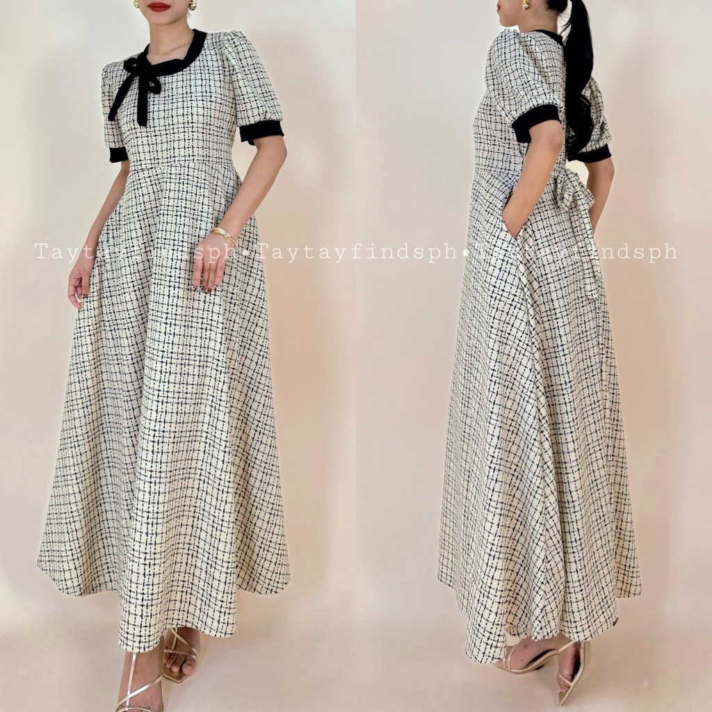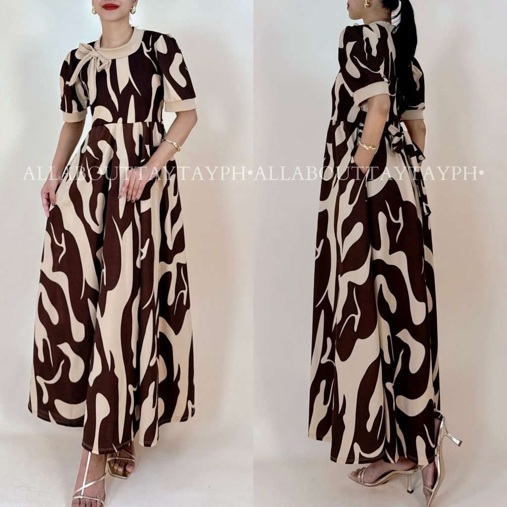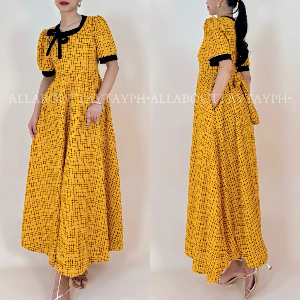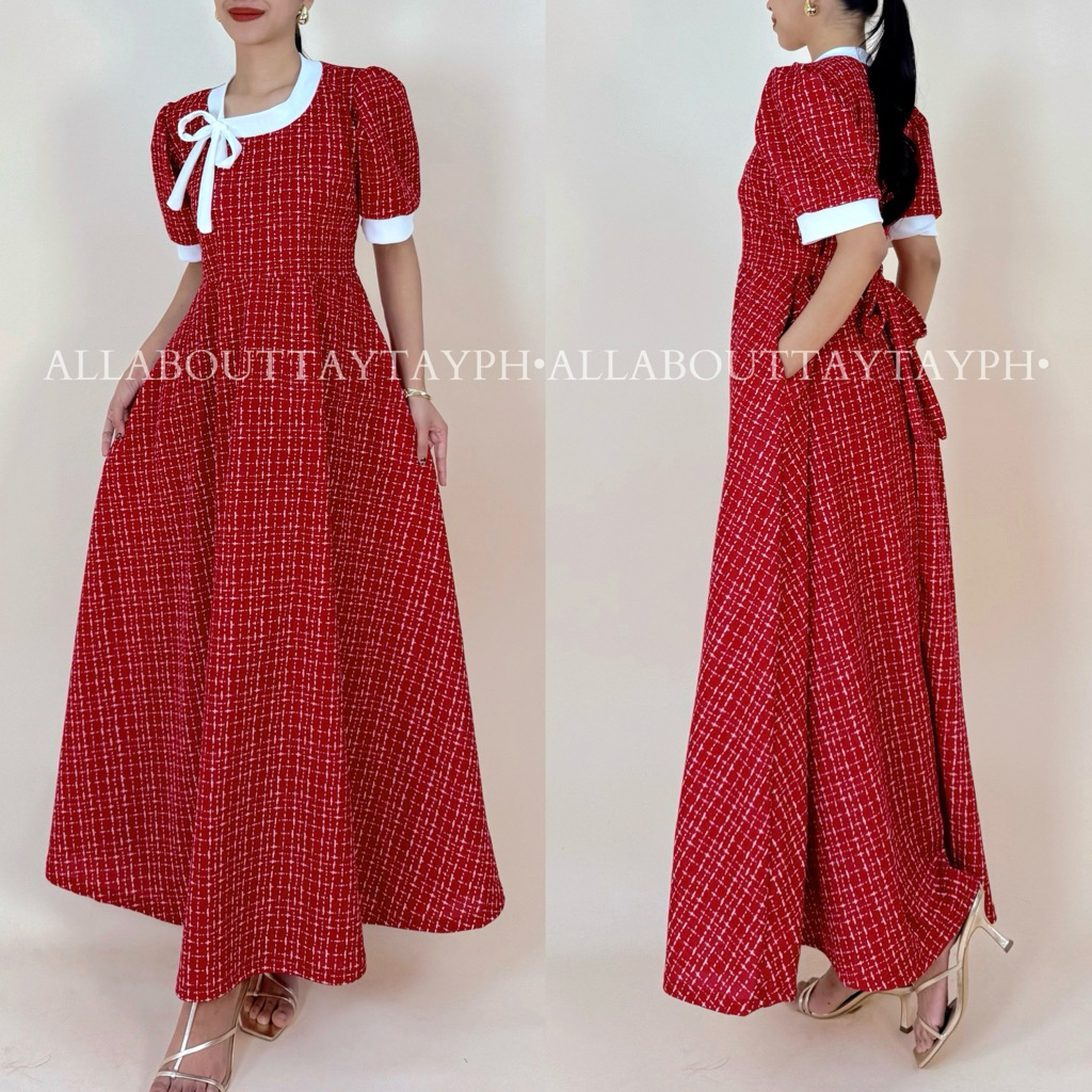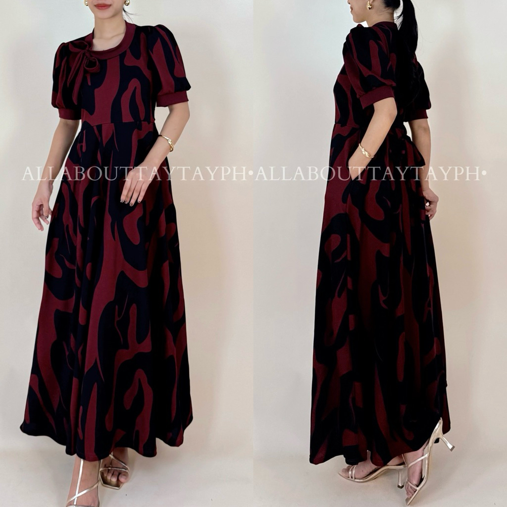 CLAIRE RIBBON TIE COLLAR COMBI CHURCH MAXI DRESS CREPE FABRIC
