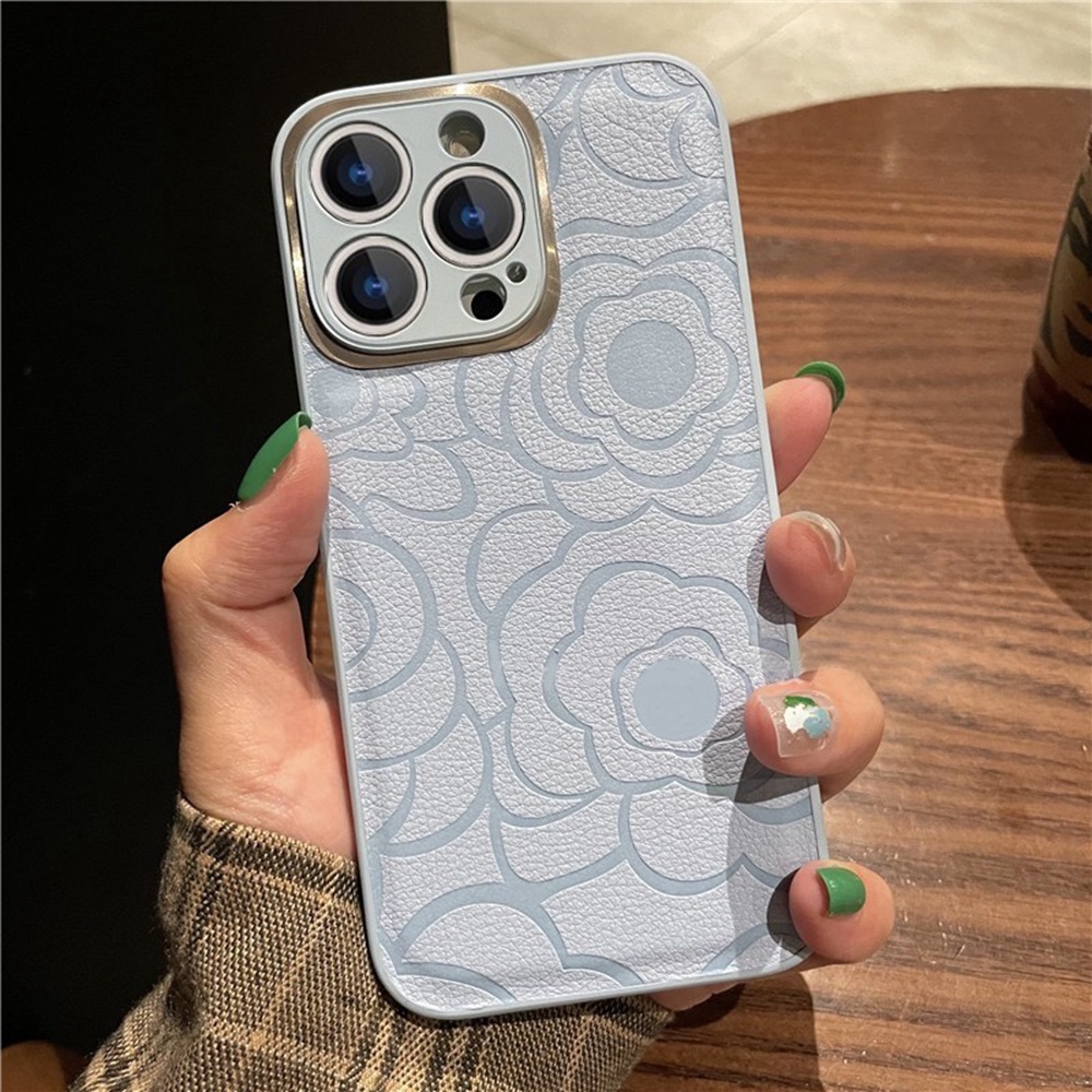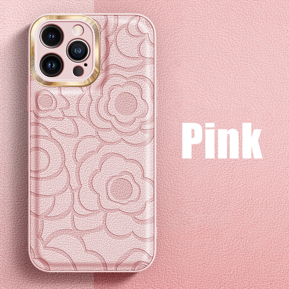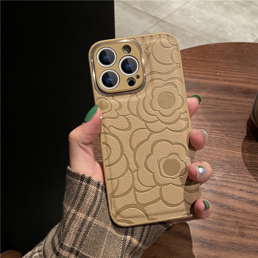 Camellia Pattern Embossed Metal Lens Ring Phone Case for IPhone 15 Pro Max 11 12 13 14 Pro Max Leather Soft Shockproof Cover