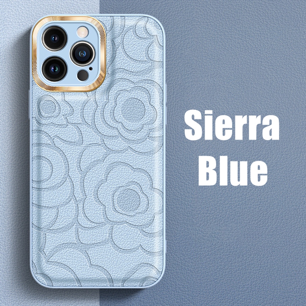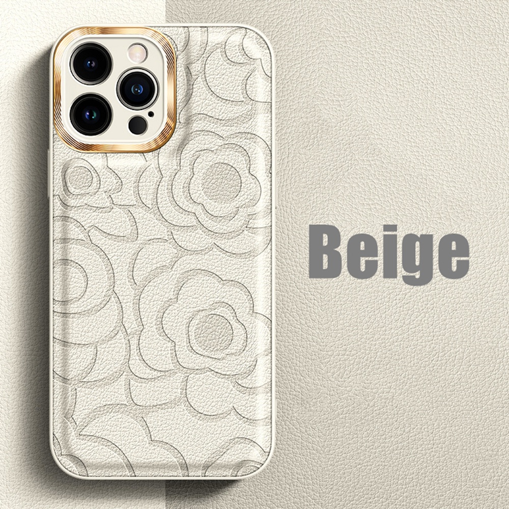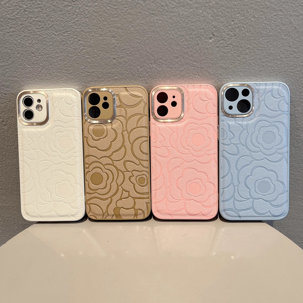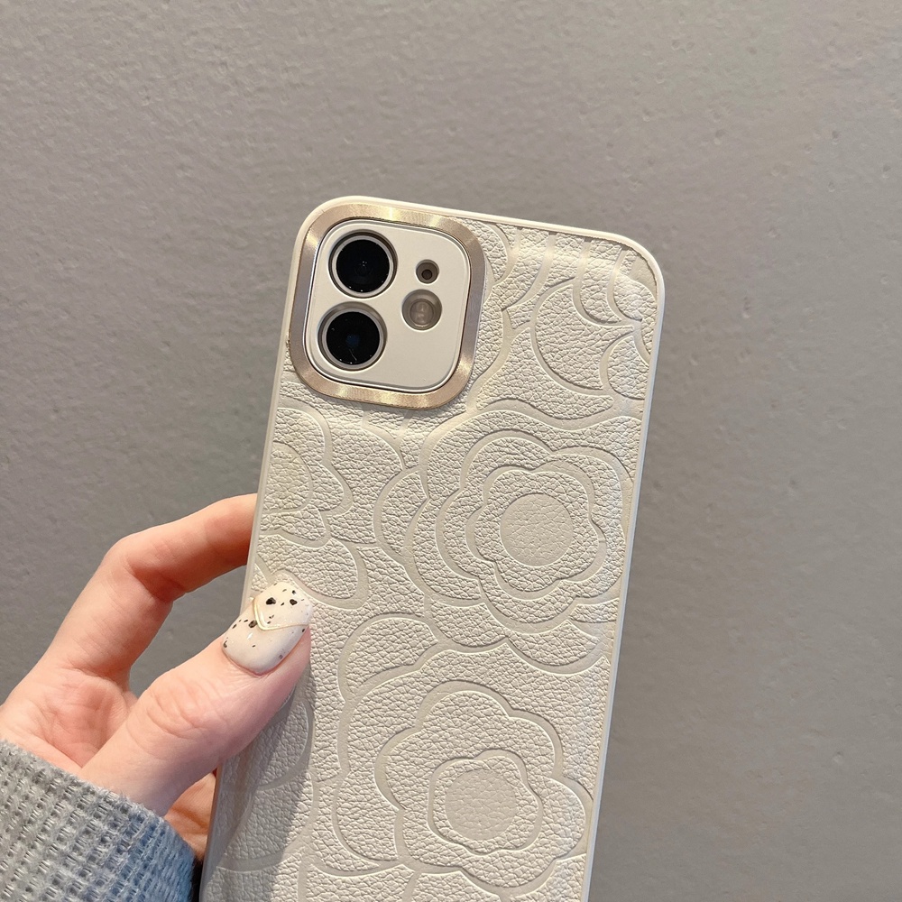 Camellia Pattern Embossed Metal Lens Ring Phone Case for IPhone 15 Pro Max 11 12 13 14 Pro Max Leather Soft Shockproof Cover