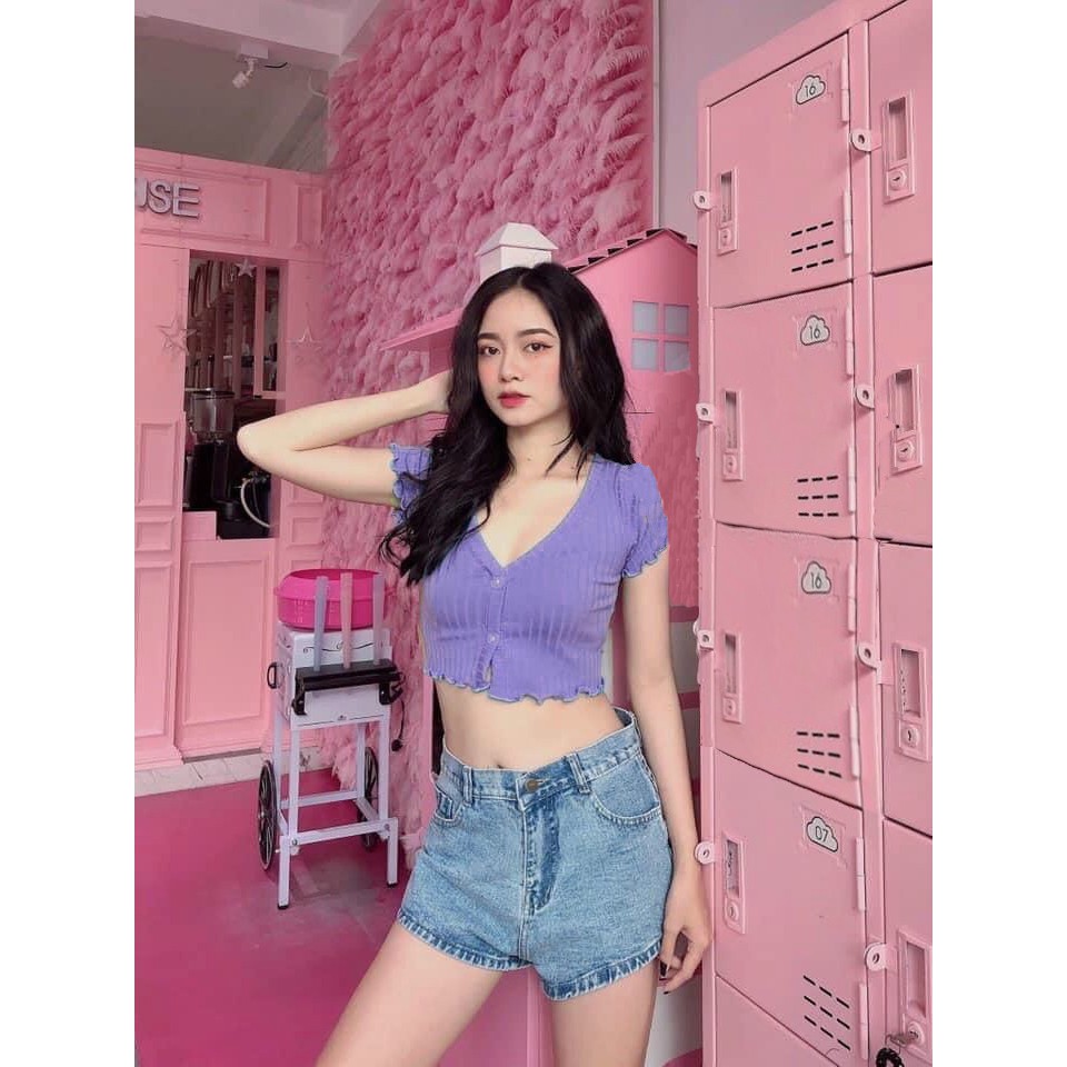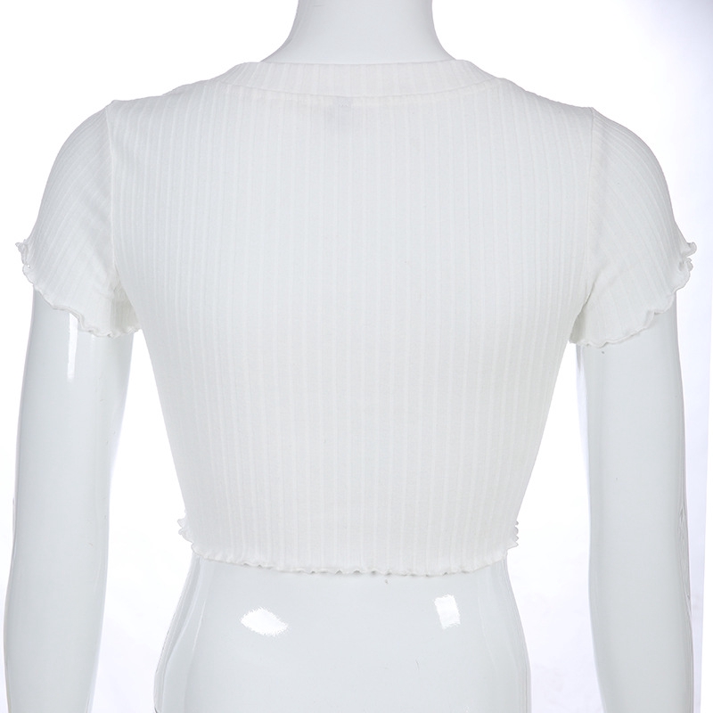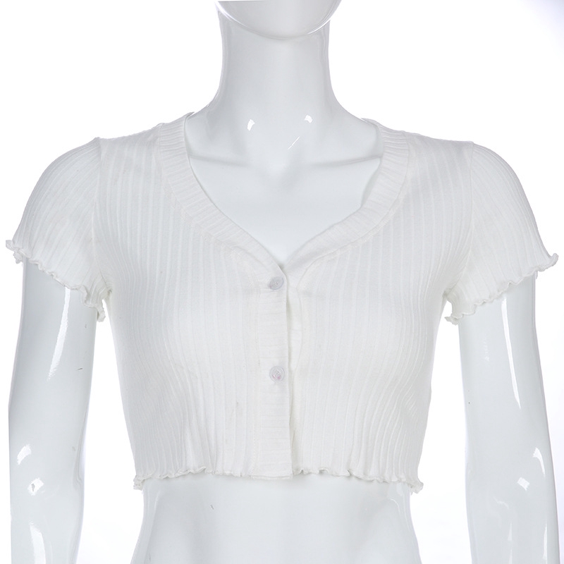 WEANIA Button Front Lettuce Hem Rib Knit Crop Top