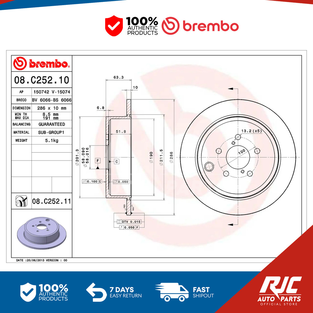 BREMBO ROTOR DISC REAR TOYOTA SCION FR-S 2012-2013 08C25211 ( 2 PCS )