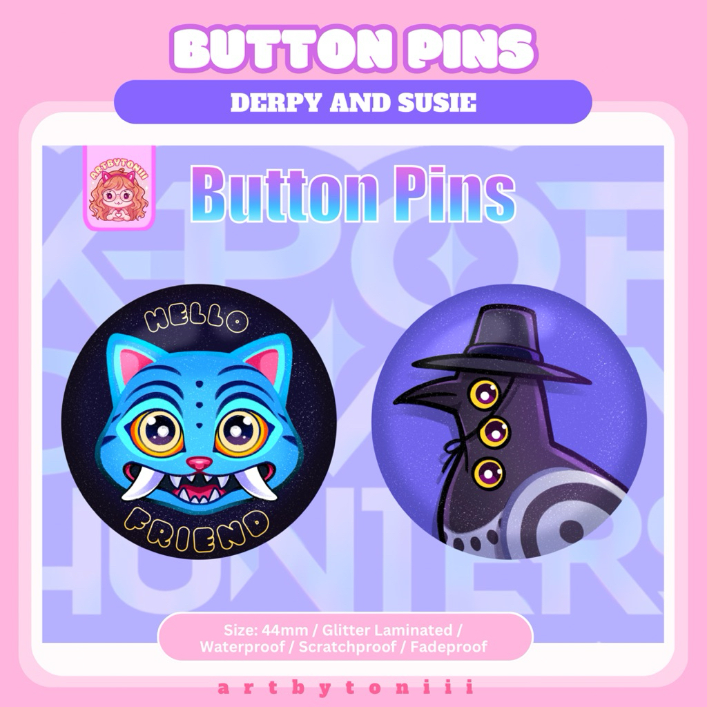 DERPY AND SUSIE KPOP DEMON HUNTERS BUTTON PINS 44mm | Glitter | artbytoniii