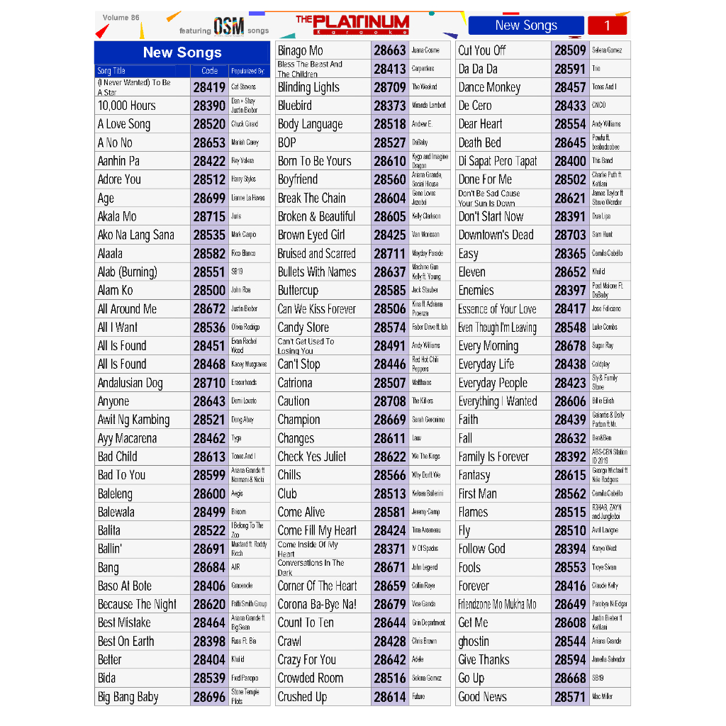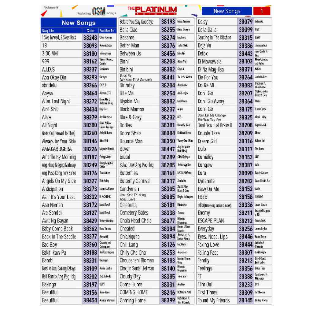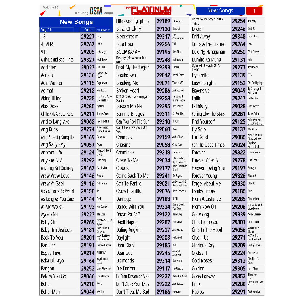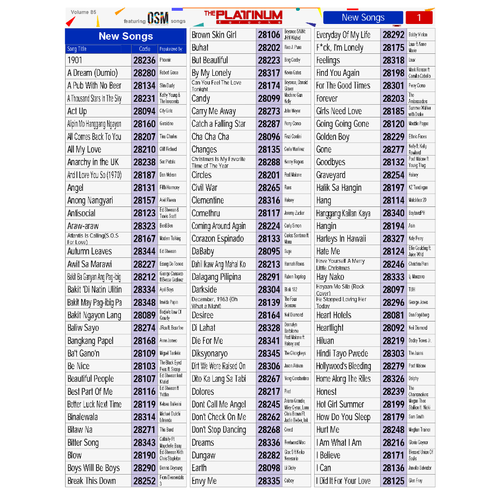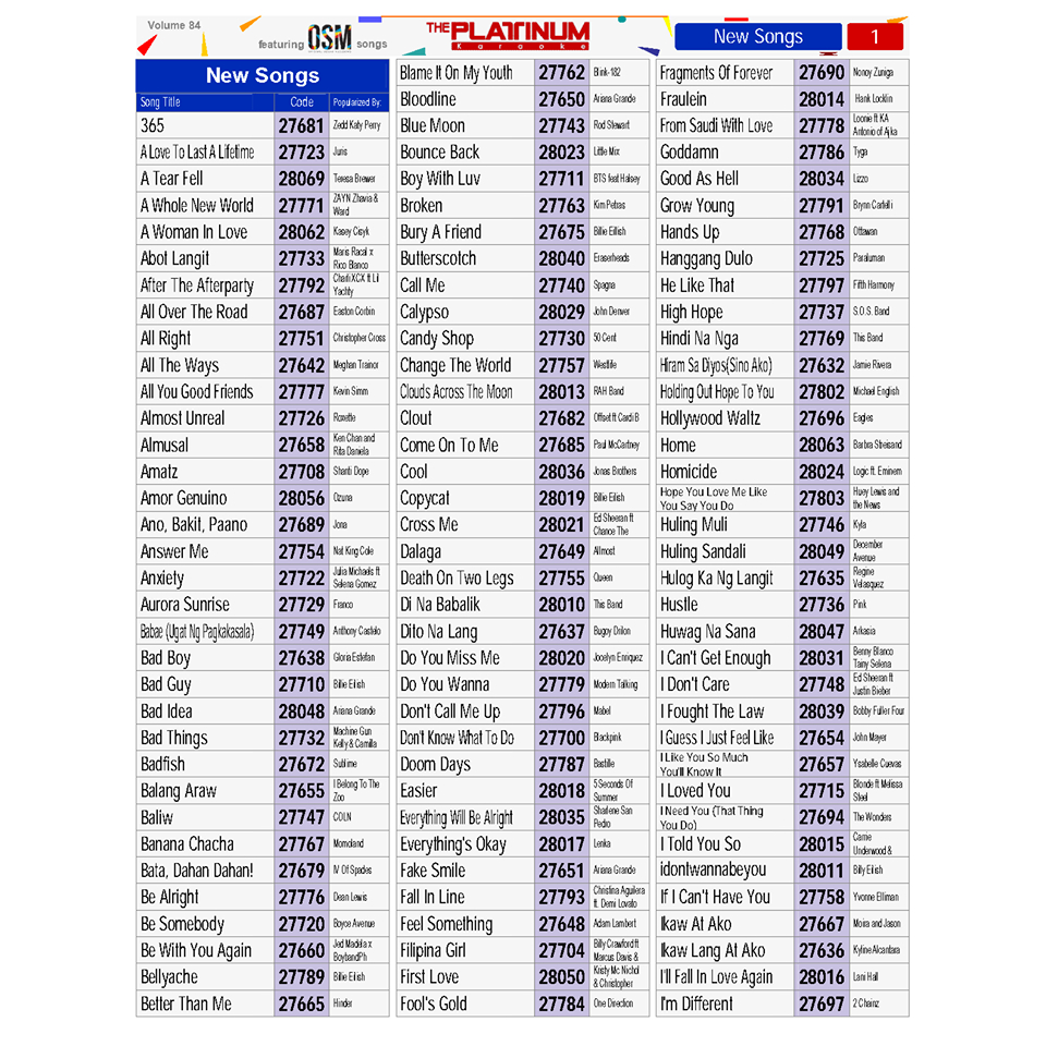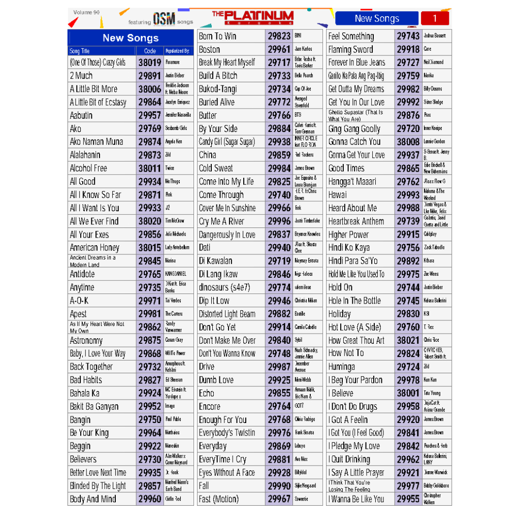 Volume 84 to 98 Song Lists of Platinum Flute, Kapitan, Piano, PK-10, Reyna Players (54 Pages)