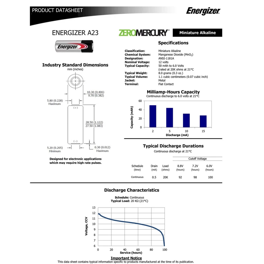 Energizer A23 Alkaline Battery 12V Zero Mercury for Remote Control Car Key Door Bell Energizer 23A B