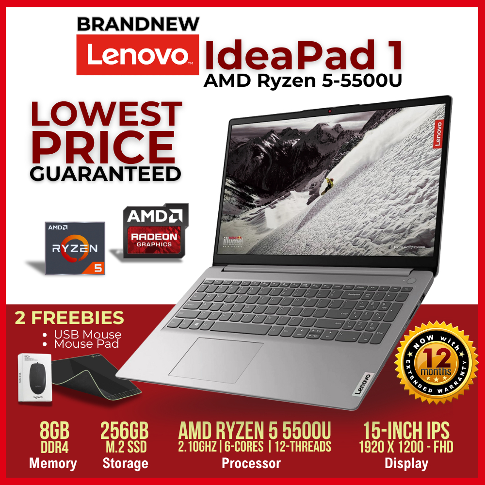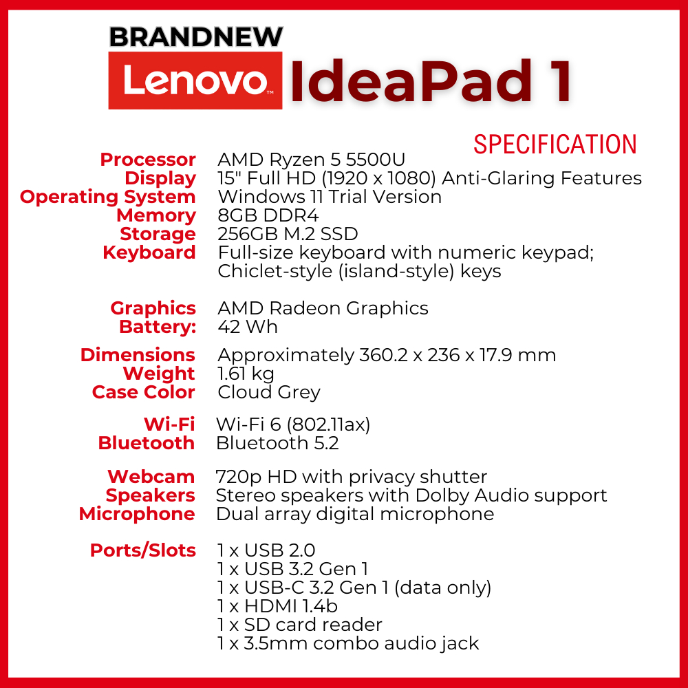 Lenovo IdeaPad 1 15ALC7 AMD Ryzen 5 5500U Laptop | 8GB DDR4 | 256GB SSD | 15” FHD - Thin & Light