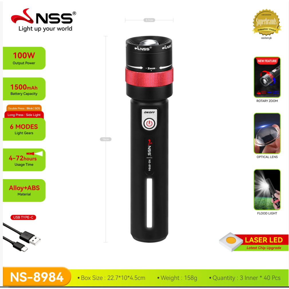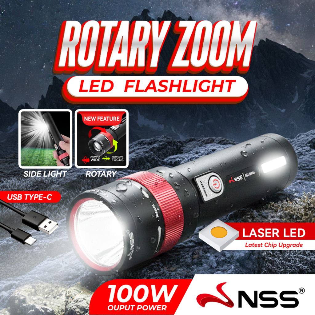 NSS 100W Multifunction Rotary Zoom Flashlight Waterproof Rechargeable Outdoor Torch Super Bright