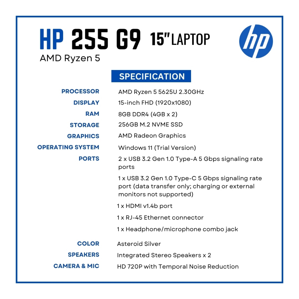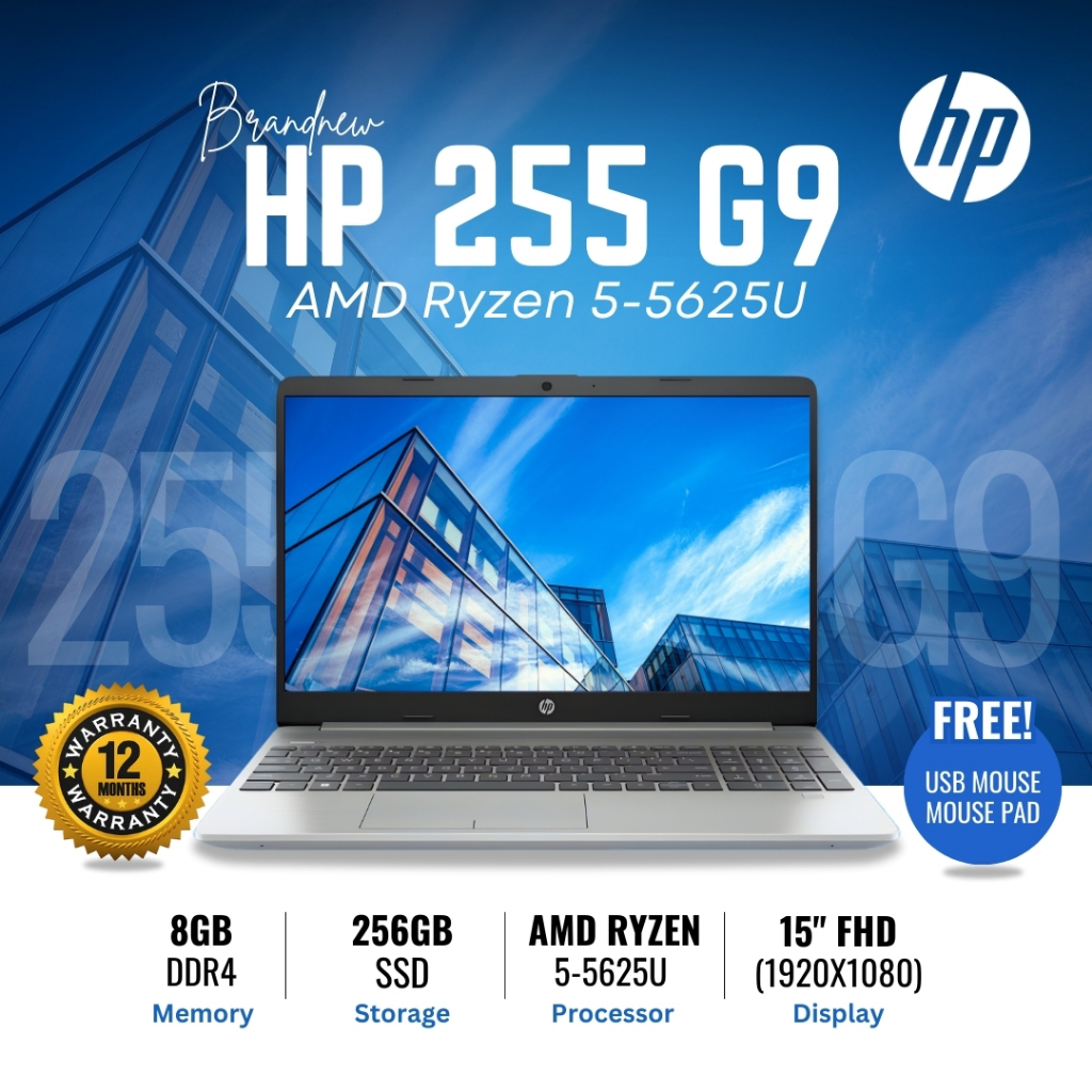 B/N HP 255 G9 AMD Ryzen 5 Laptop | 8GB DDR4 | 256GB M.2 SSD | 15" FHD Display | Reliable Performance