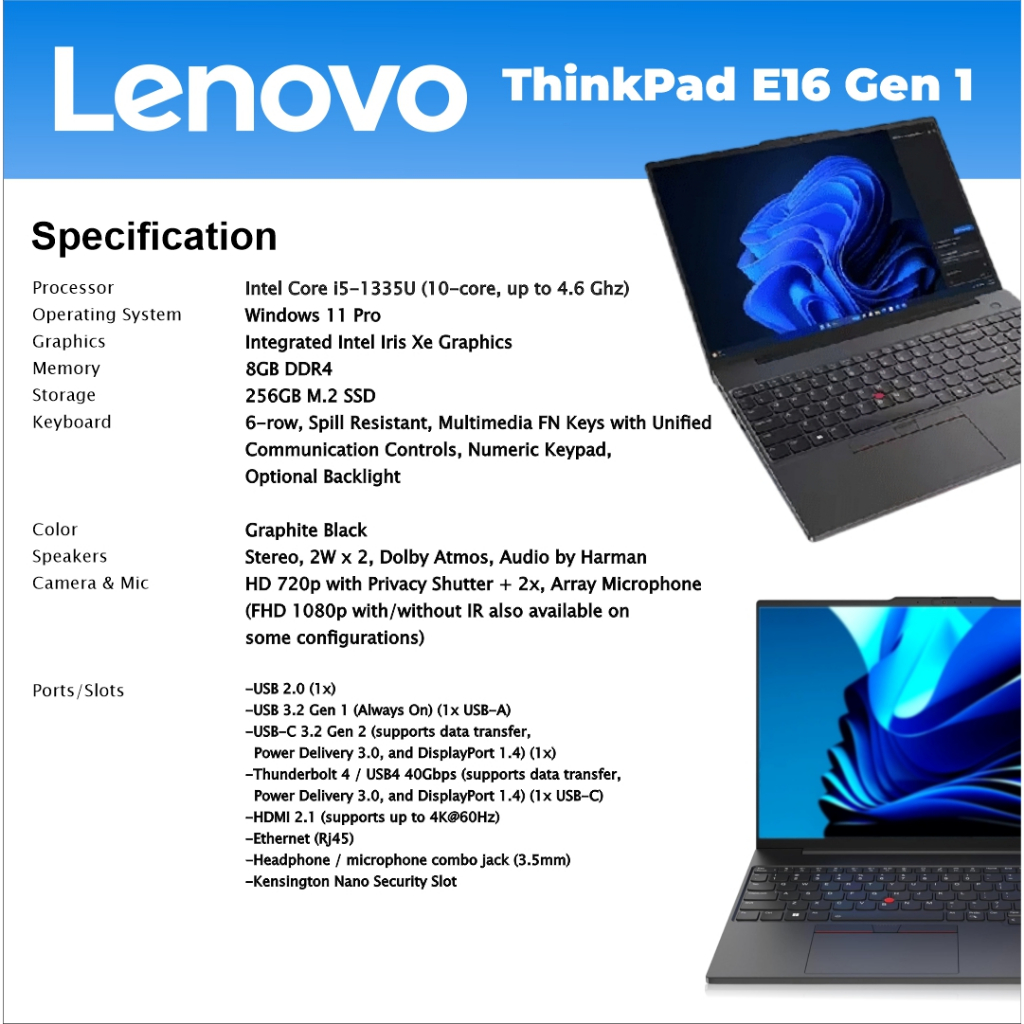 LENOVOTHINKPAD E16 G1 LAPTOP INTEL i5-13th GEN 8GB RAM 256GB SSD 16"' IPS FHD SCREEN BUILT FOR WORK