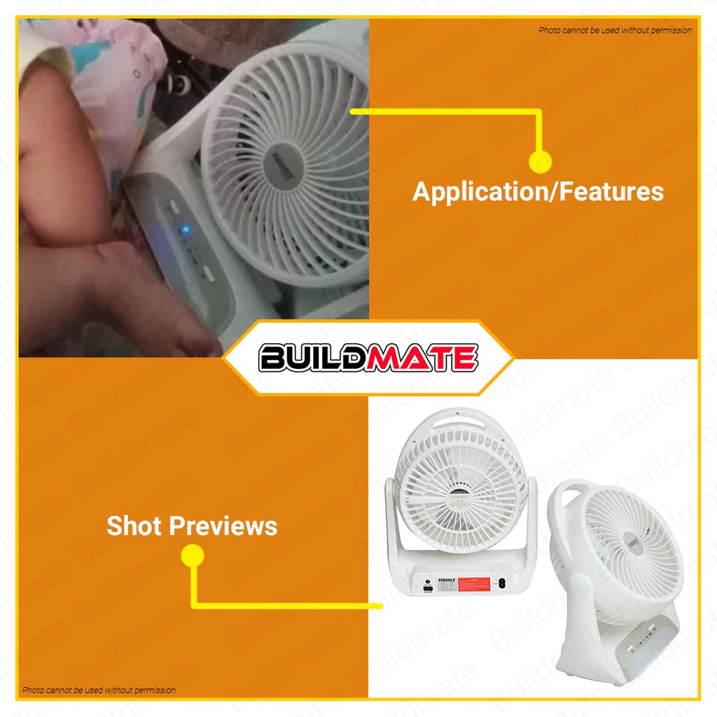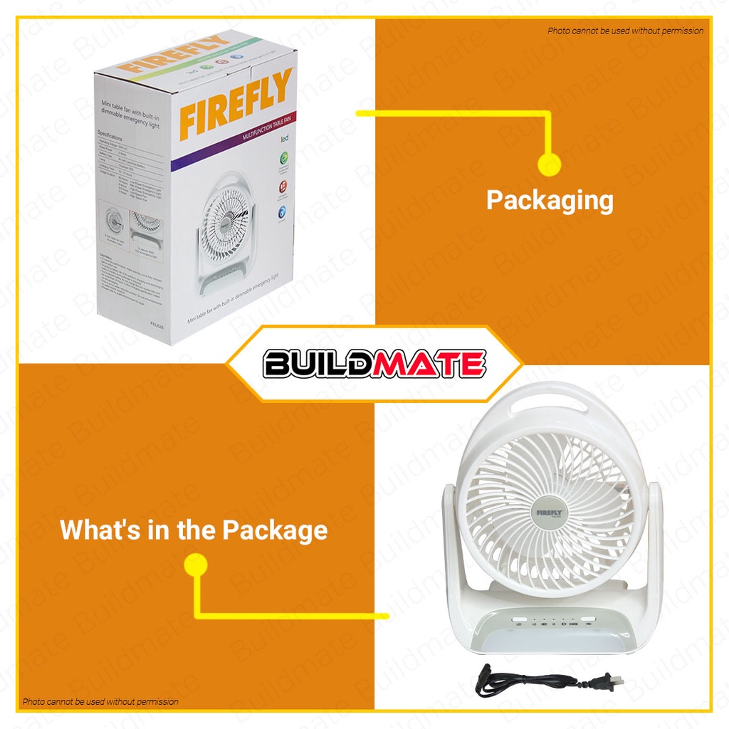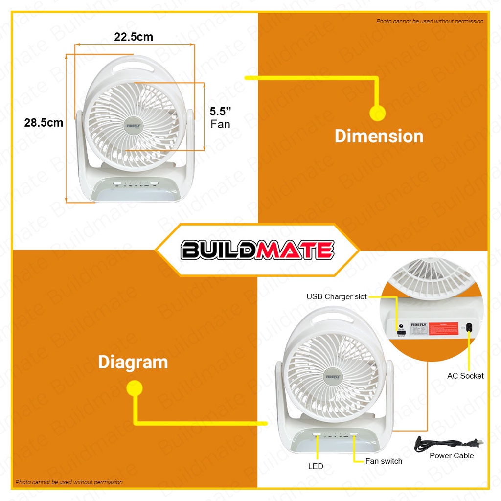 Buildmate x FIREFLY 5.5" 2W 3Ah Rechargeable Fan With DC Socket & LED Lights Desk Table Fan FEL628