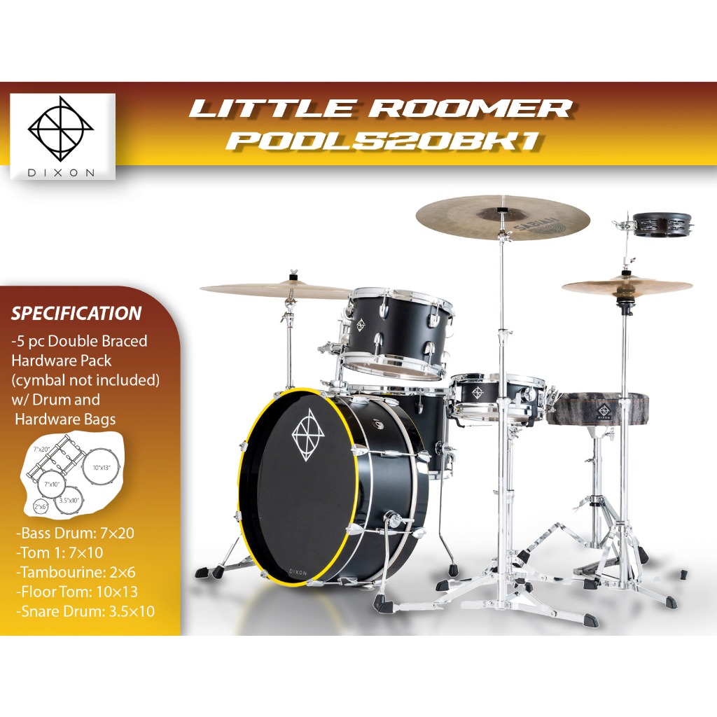 DIXON LITTLE ROOMER MAHOGANY SHELL DRUM SET , BLACK/YELLOW BASS HOOP W/ BOOM STAND, CYMBAL STAND