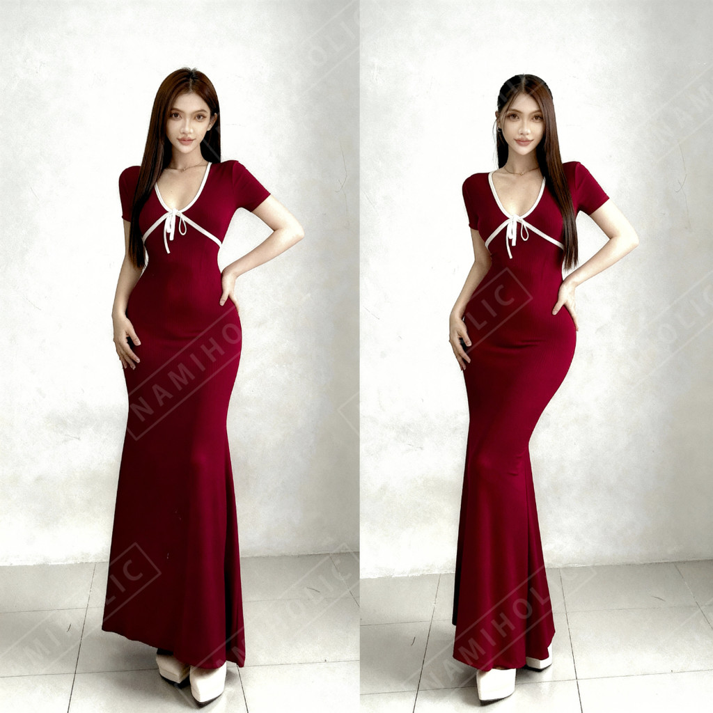 Namiholic Angelie Vneck Ribbon Maxi Dress I Knitted Fabric I XS to SEMI-MEDIUM