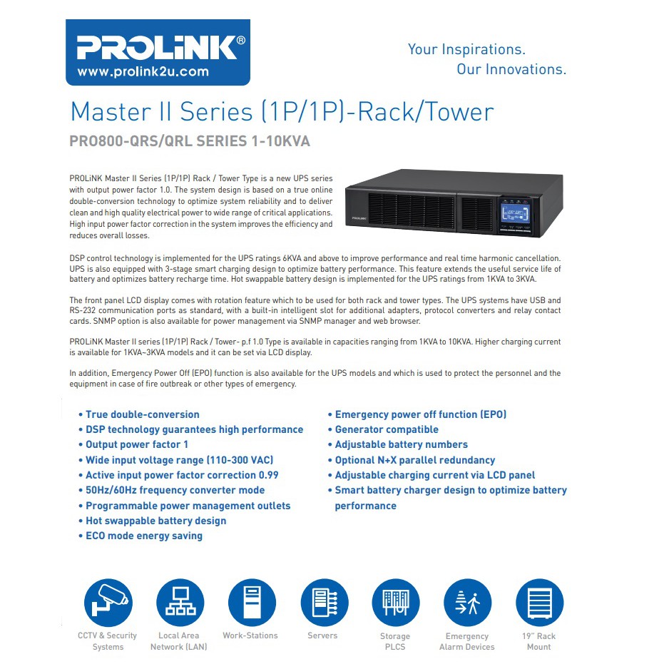 PROLiNK 6KVA/6KW (1P/1P) Power Supply True Double-Conversion Online UPS With 2 X Railkit PRO806-QRS