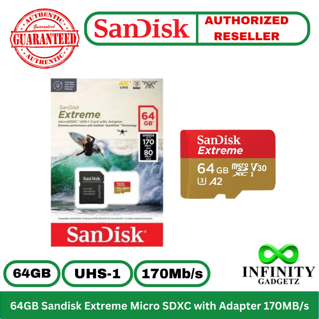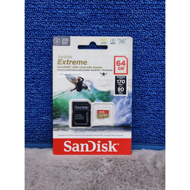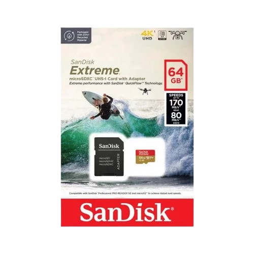 SanDisk Extreme 64GB Micro SD A2 170MB/s U3 V30 For Action Cam and Drone with adapter SDSQXAH-064G