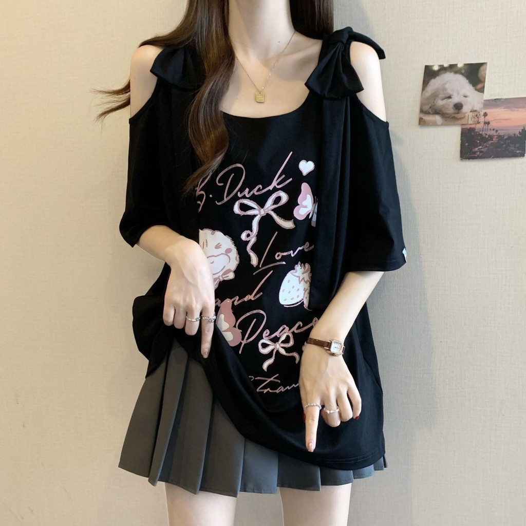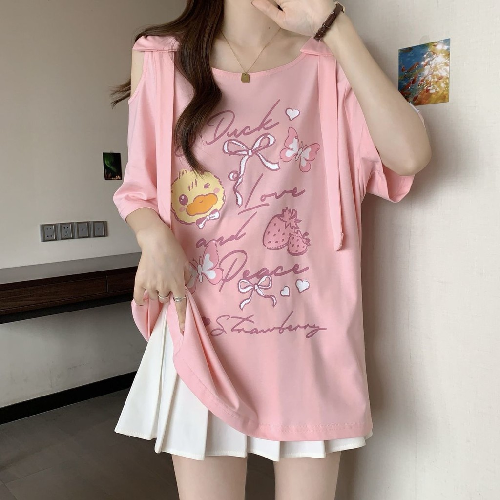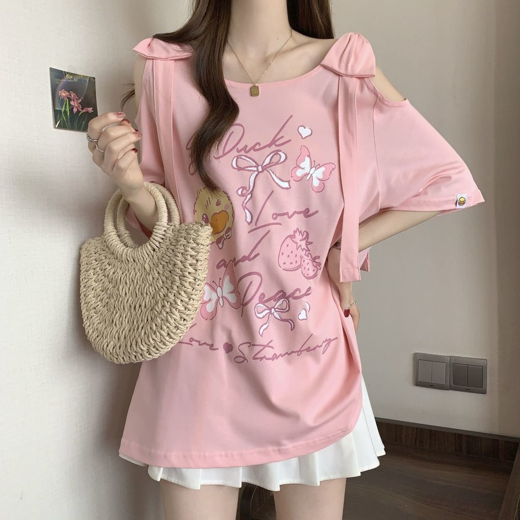 Korean Cute Tops Pink Off Shoulder T Shirt For Women Baggy Shirt Fashion
