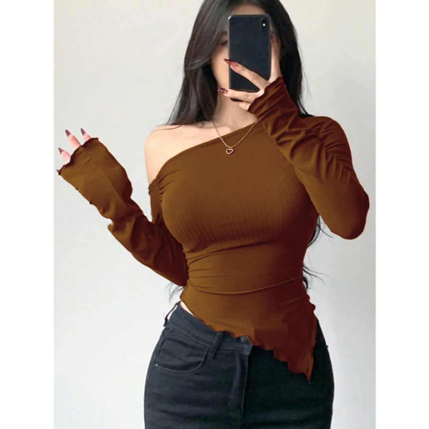 KILY.PH Assymetrical Long Sleeve Bodycon T-Shirt Knitted Tops for Women XS-M 6A0293