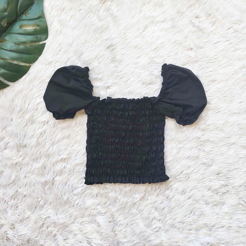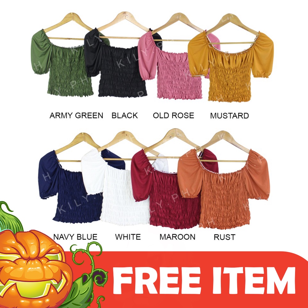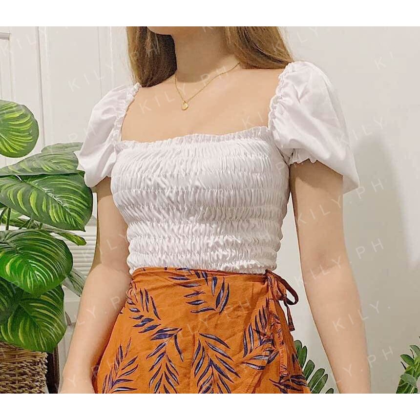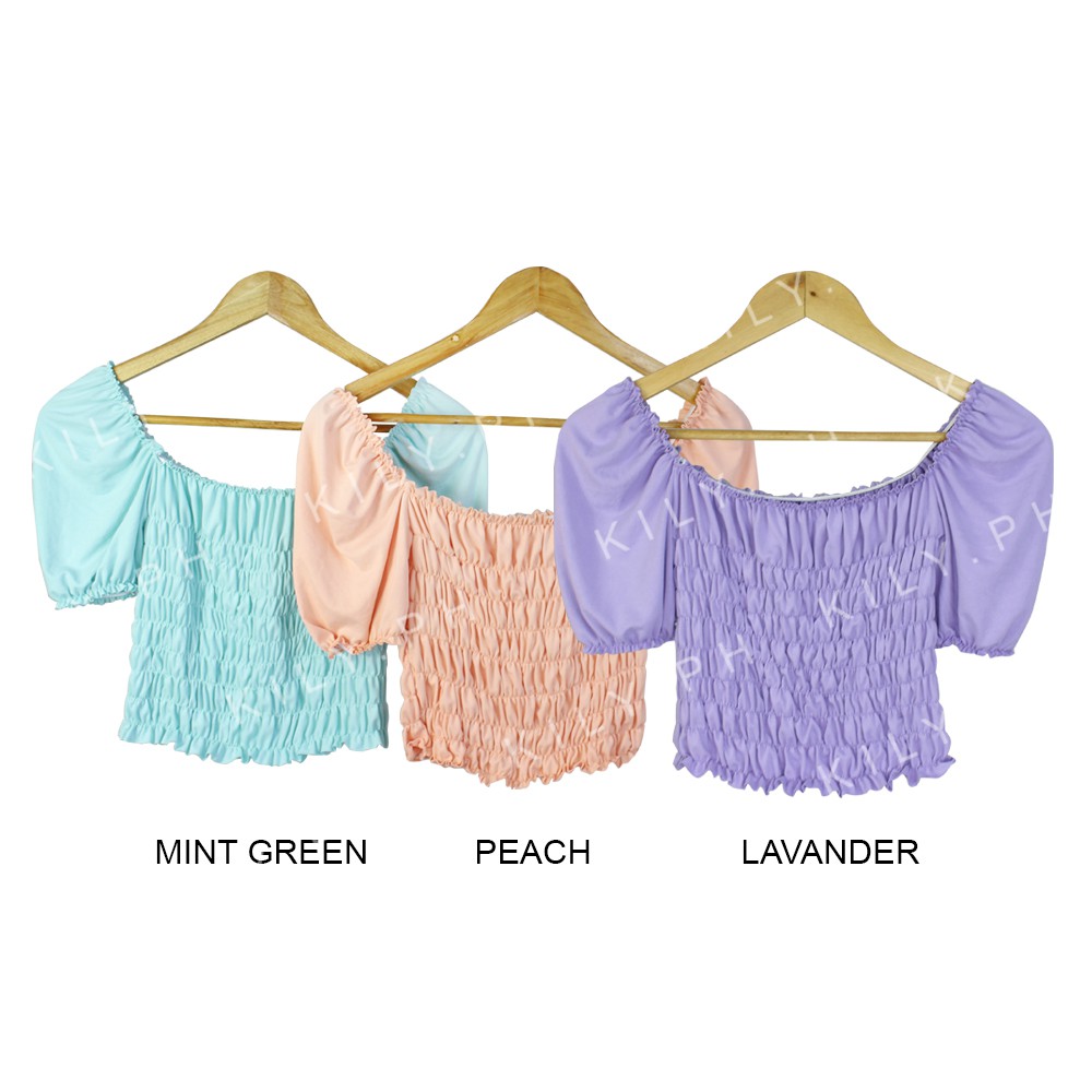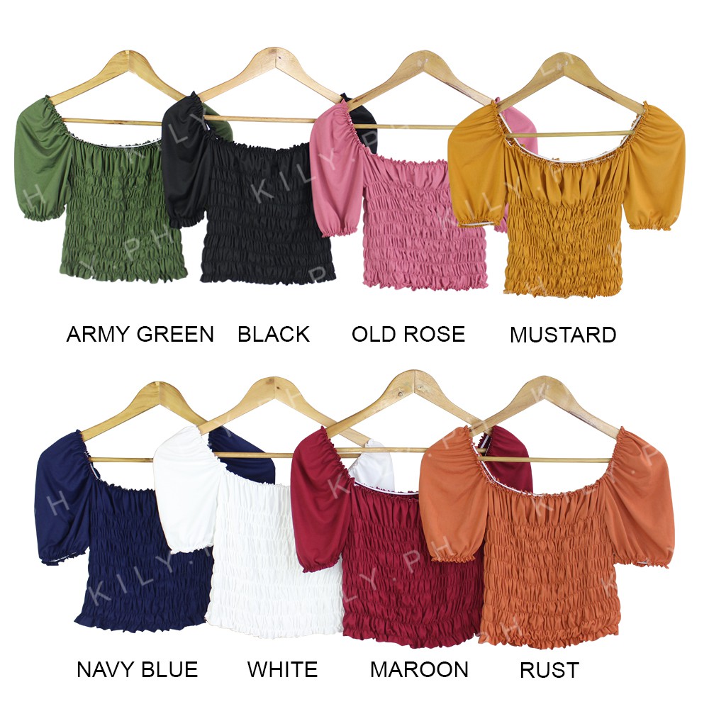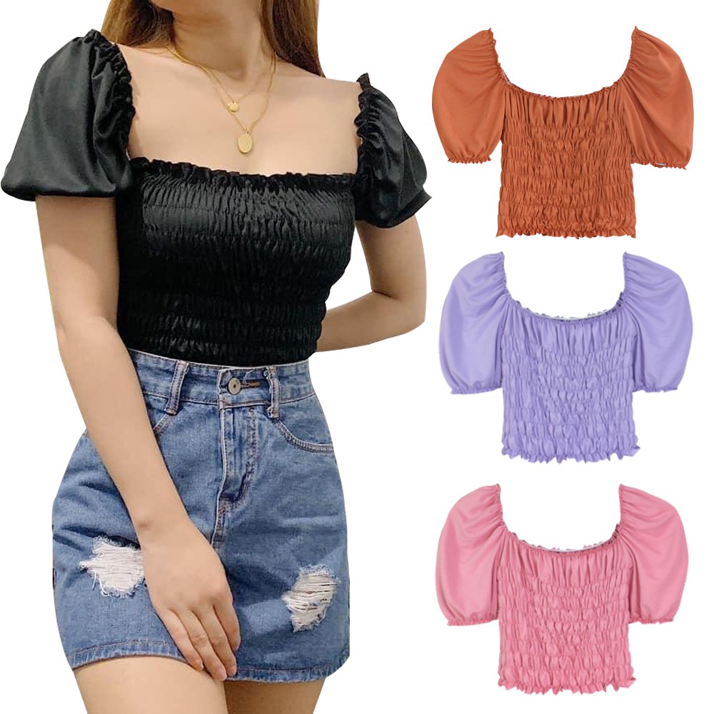 Kily.PH Plain Plaid Smocking Croptop Puff Sleeve Shirt Off Shoulder High Quality Tops 6A0112