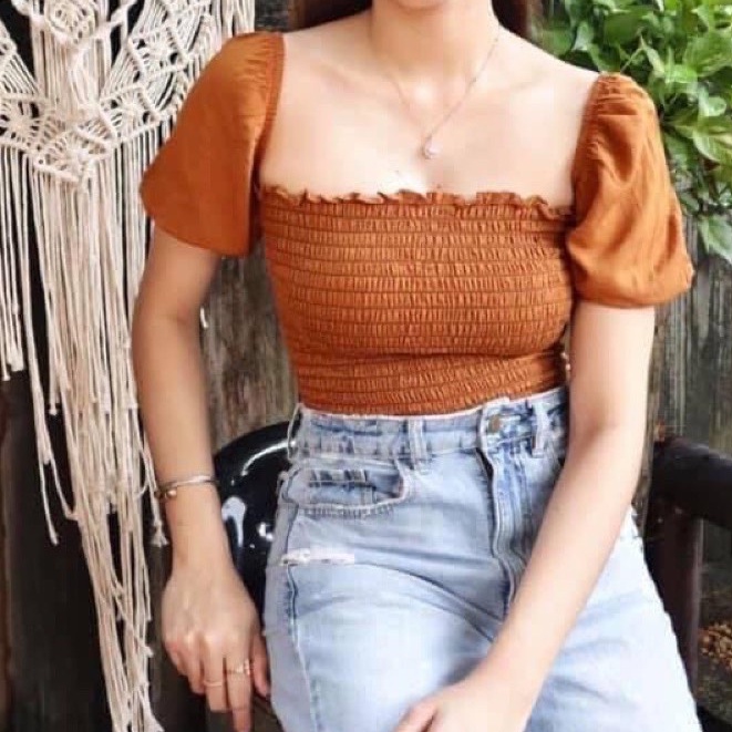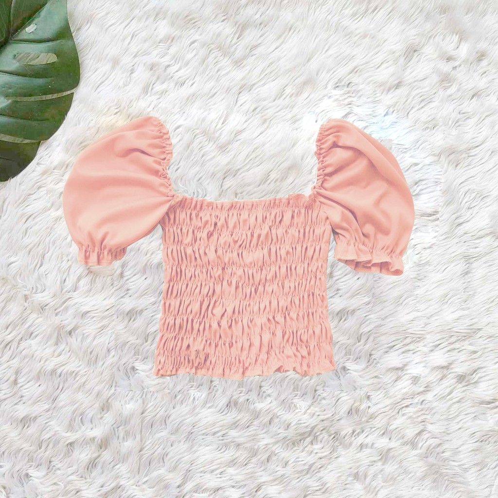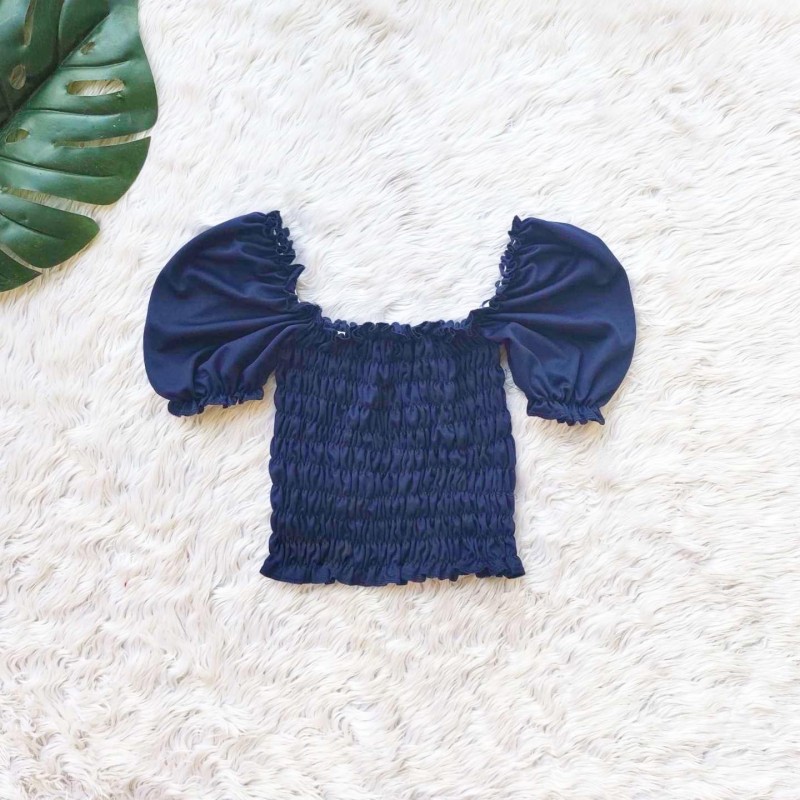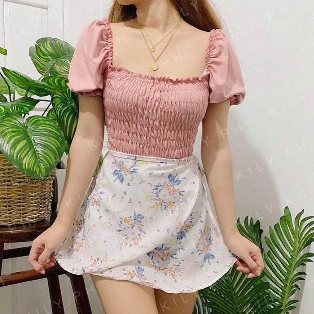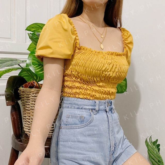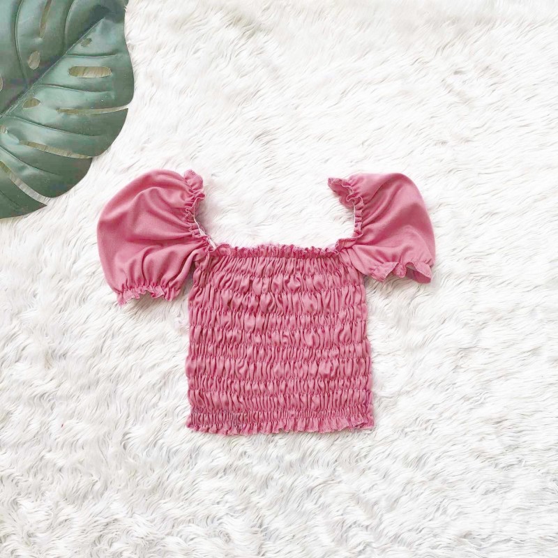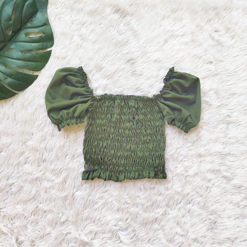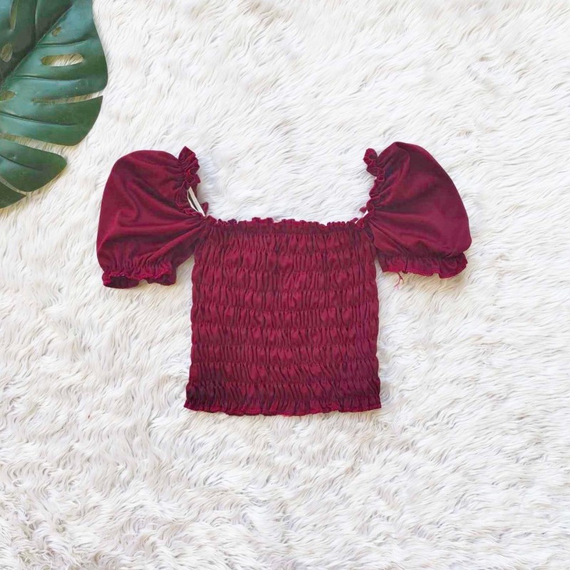 Kily.PH Plain Plaid Smocking Croptop Puff Sleeve Shirt Off Shoulder High Quality Tops 6A0112