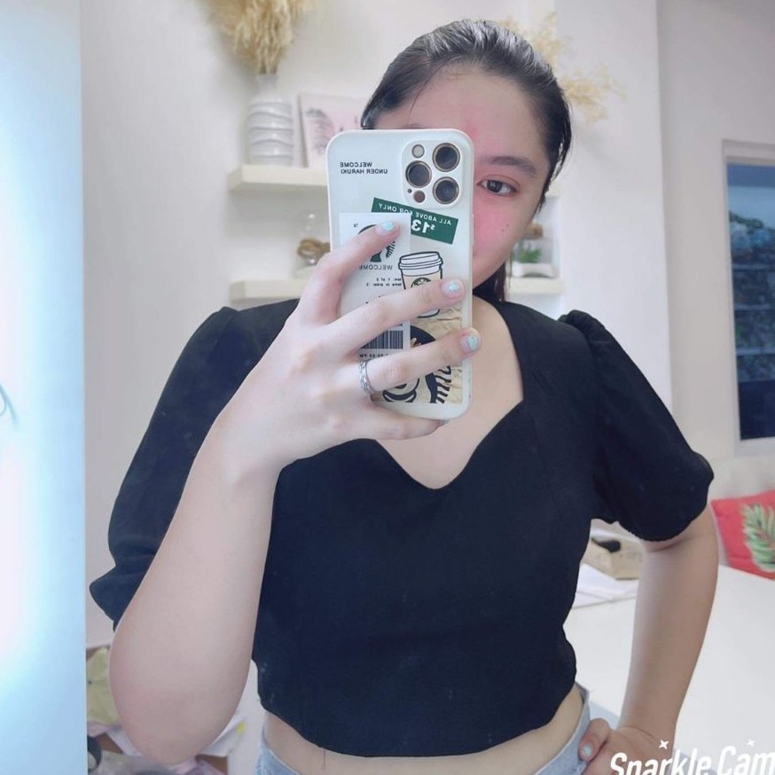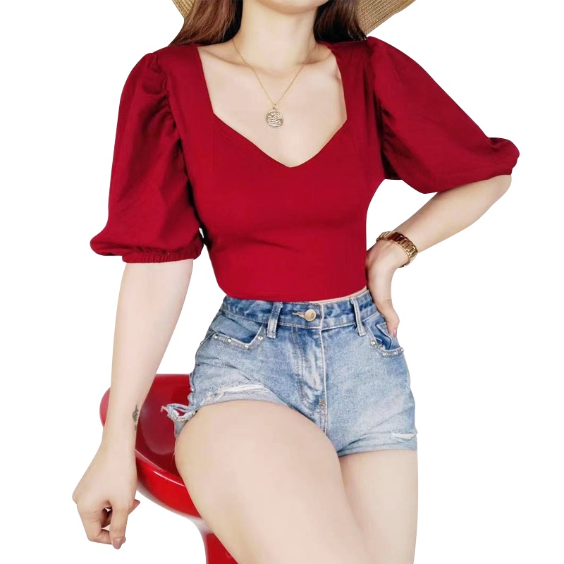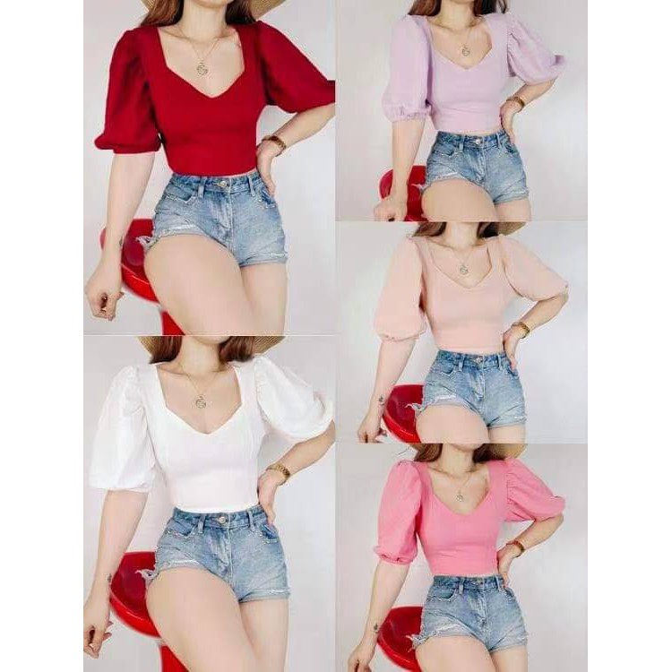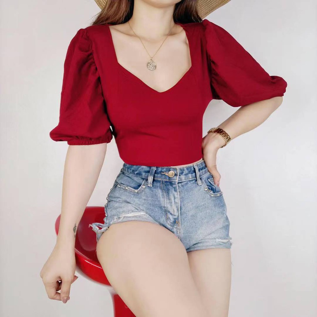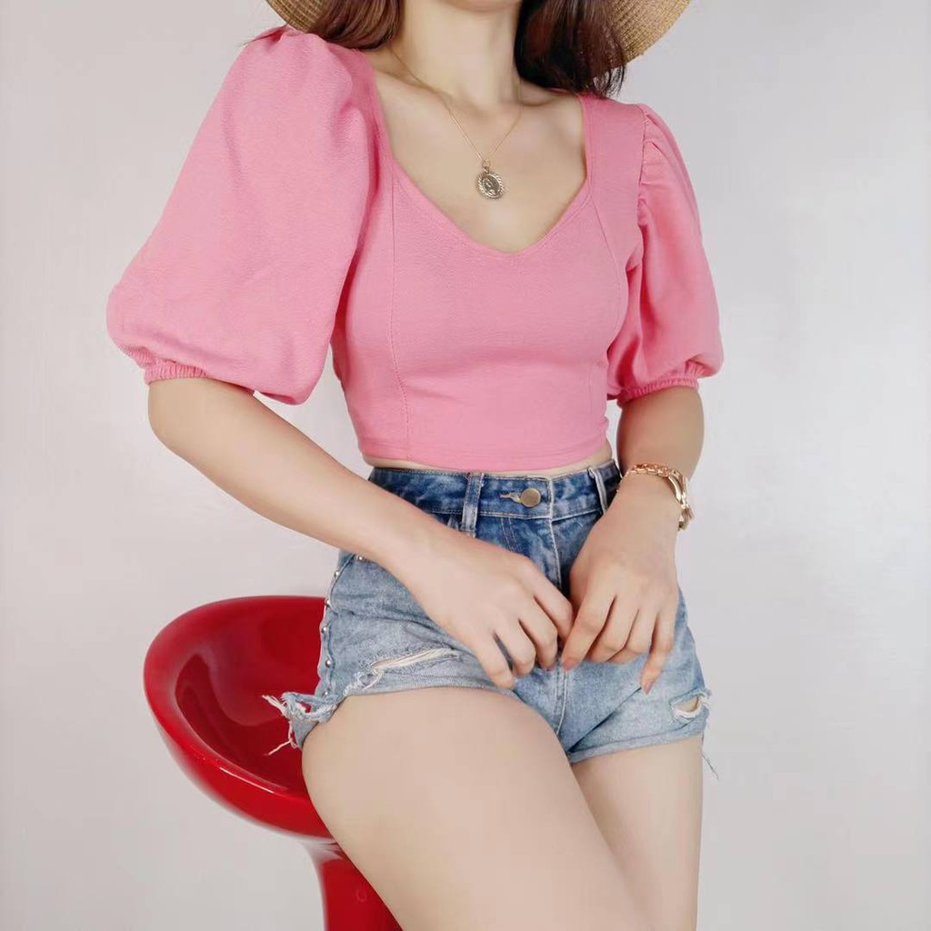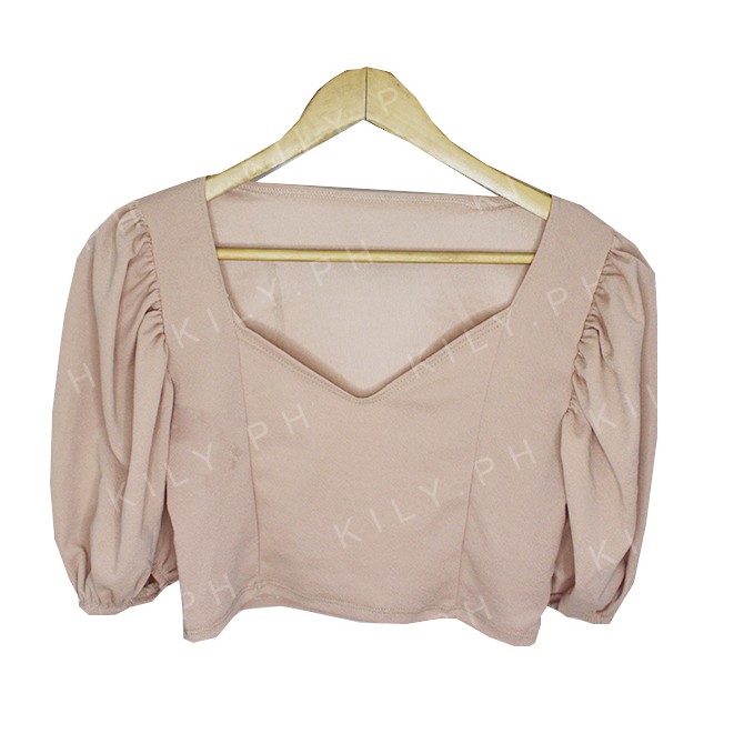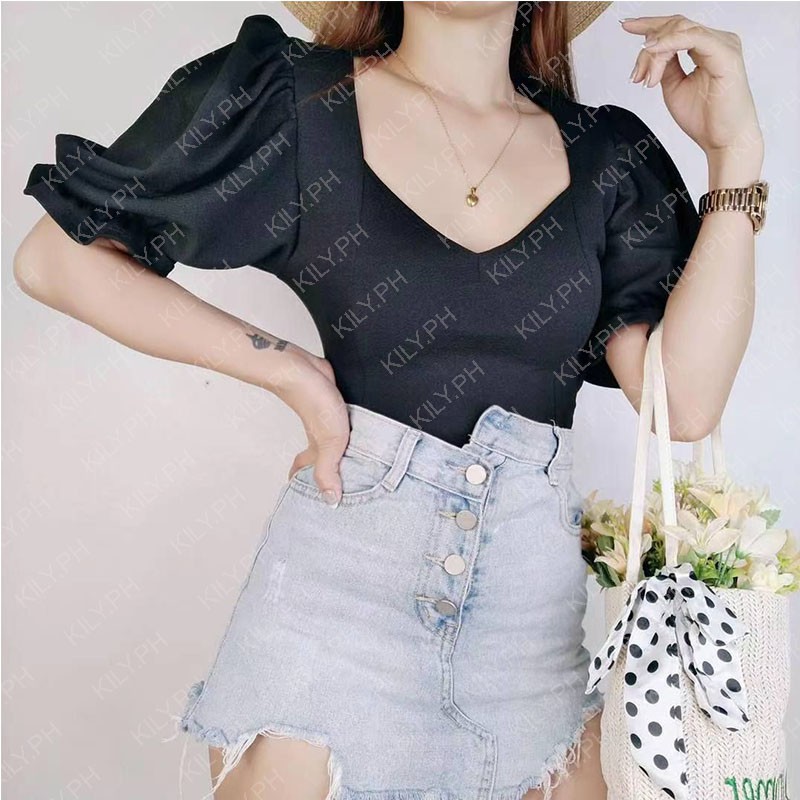 Kily.PH Puff Sleeve Plain Crop Top Oversized Square Neck Tops 6A0110