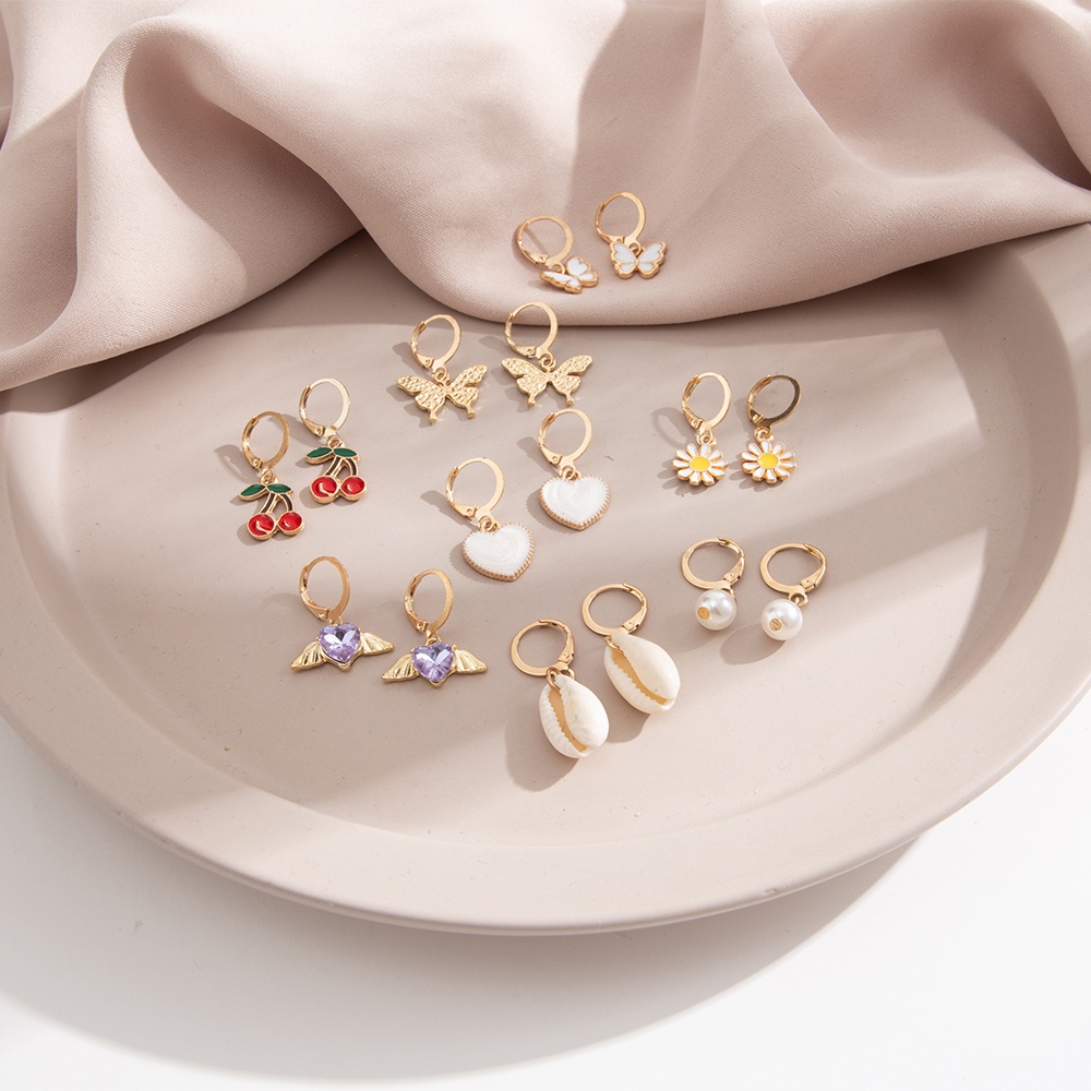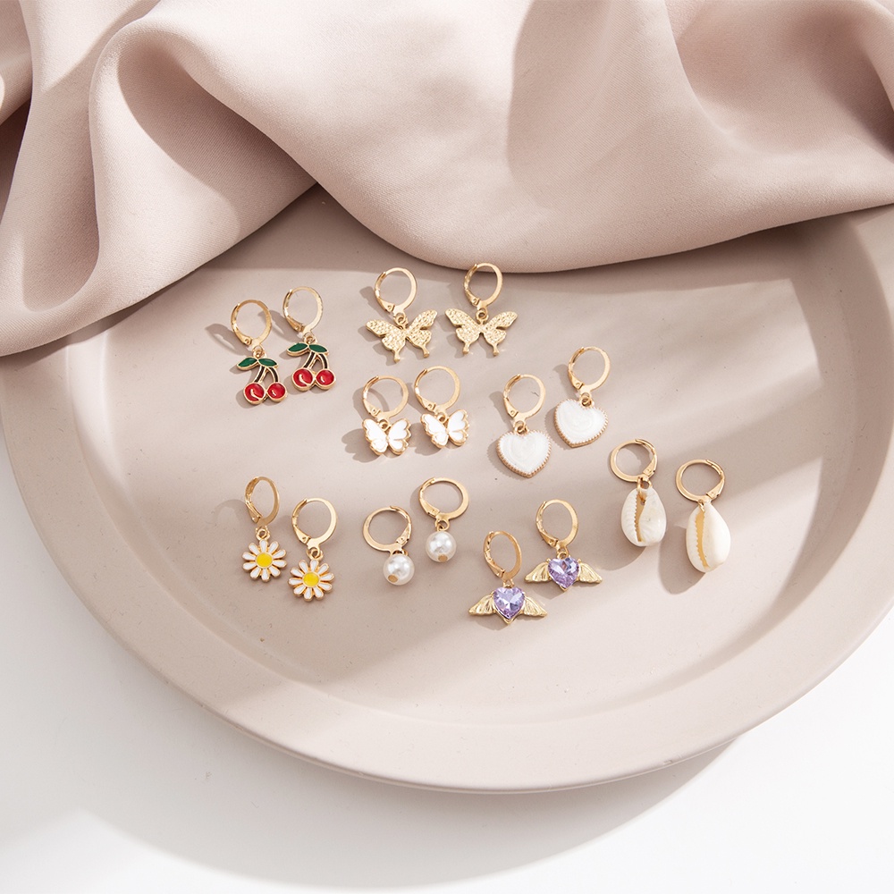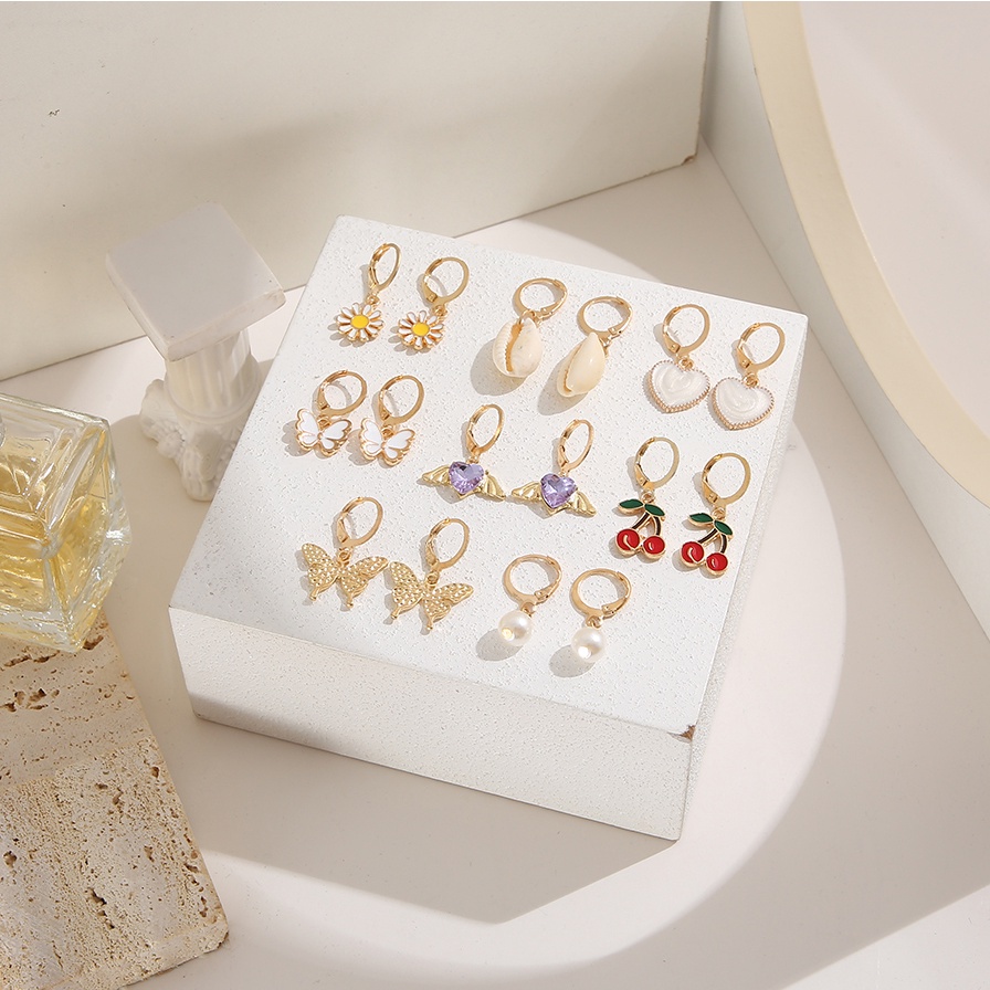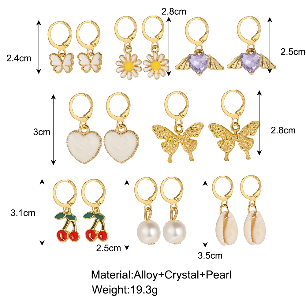 AY (CN) Pearl Shell Drop Earring Set Colorful Heart Butterfly Flower Cherry Hoop For Women 16 Pcs/Set