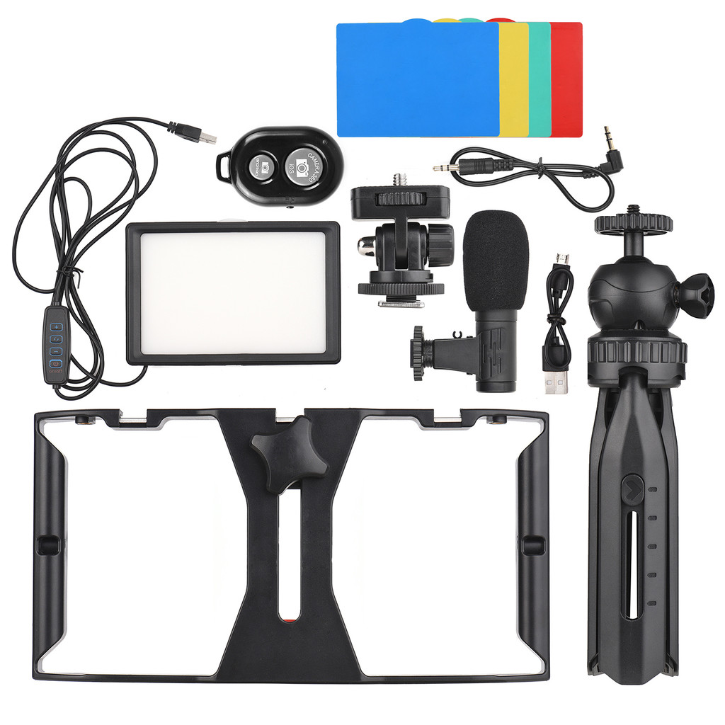 Andoer Smartphone Video Rig Vlog Kit Including Cage with Phone Clamp 3 Cold Shoe Mounts + USB LED Light 3200K-5600K 5pcs Color Filters Microphone Desk PPC1