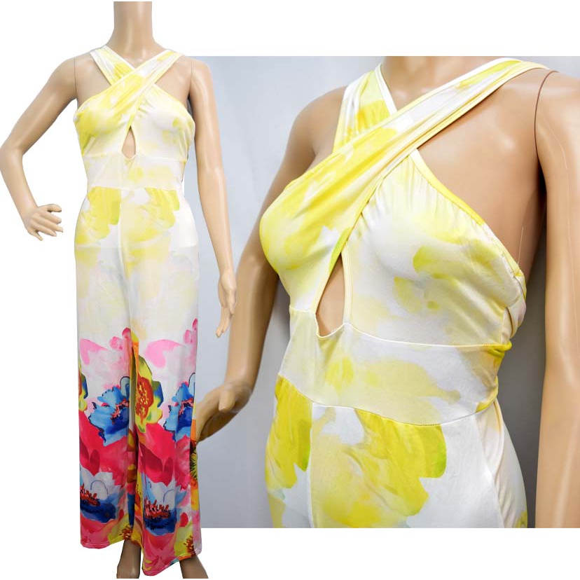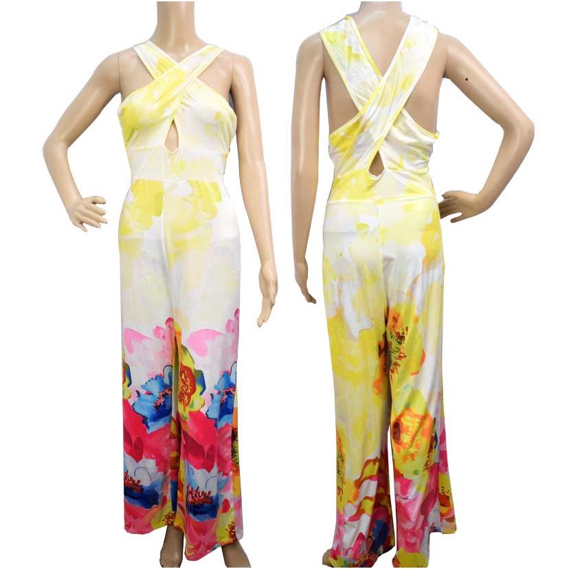 Floral Printed Wide Leg Criss Cross Halter Jumpsuit For Ladies Fashion