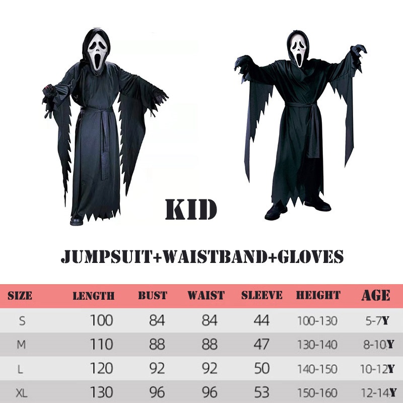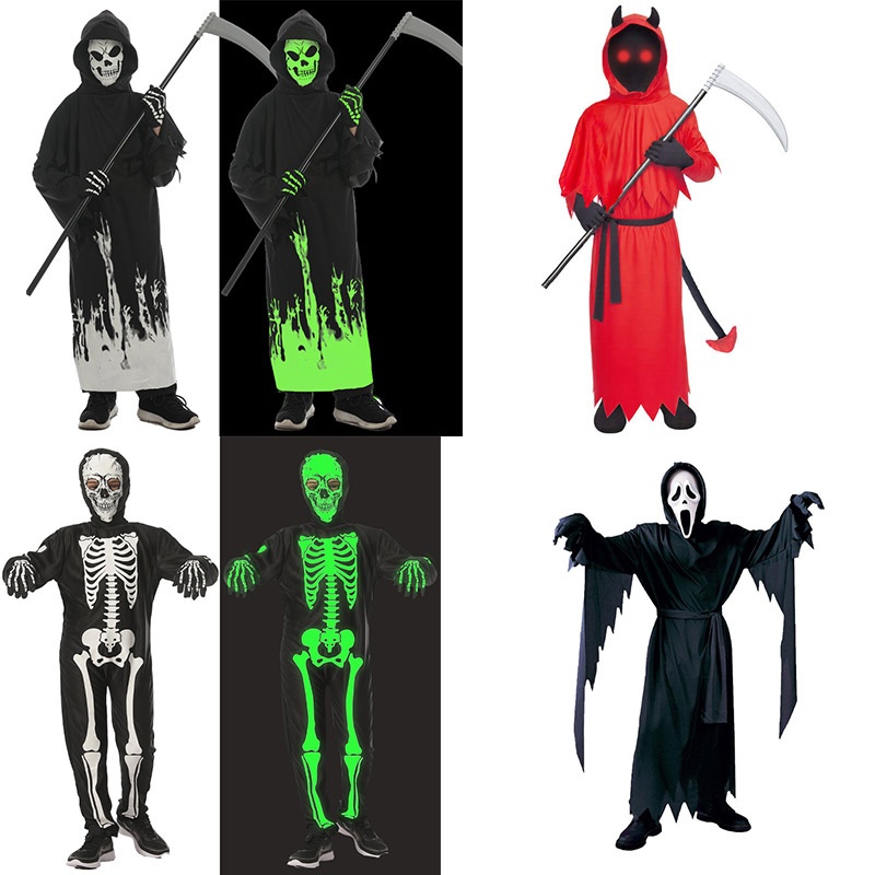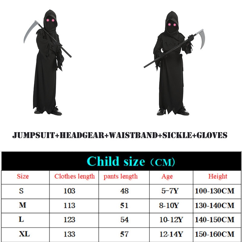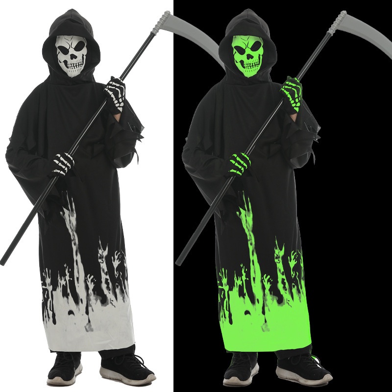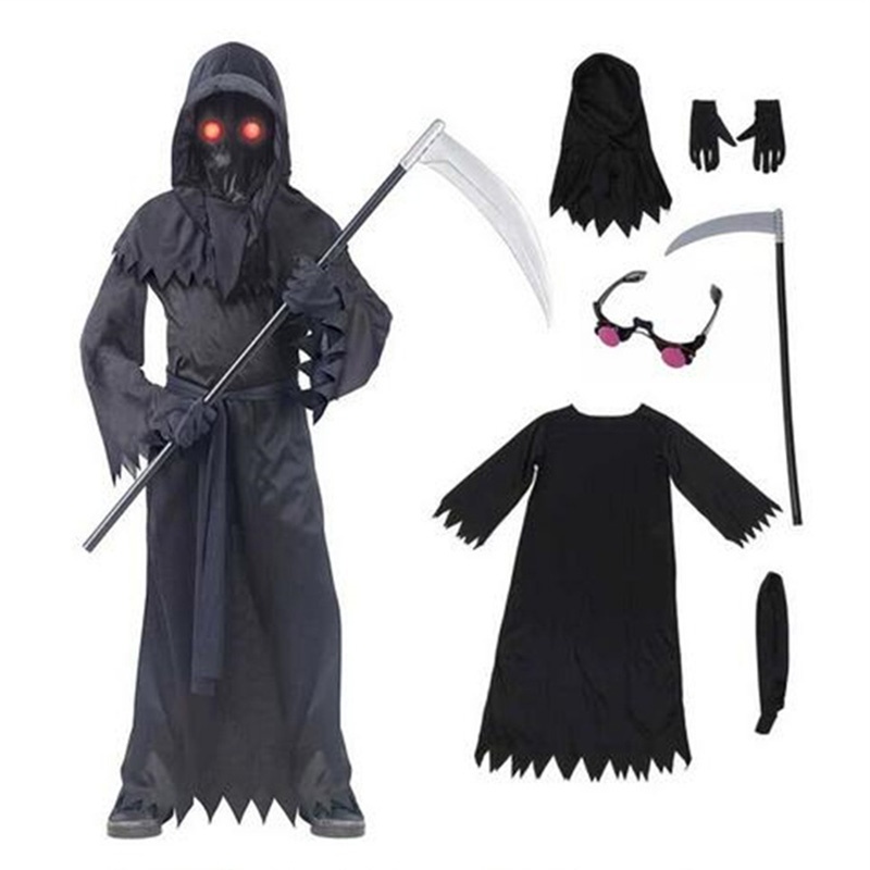 Grim Reaper Costumes Terror Luminous Eyes Death Hook Sickle Boys Cosplay Anime Scream Children Halloween Costume for Kids Carnival Prop