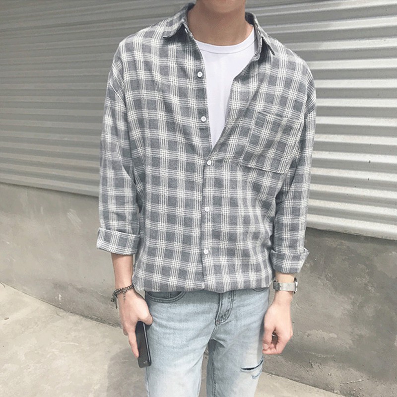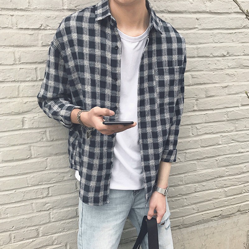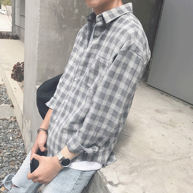 Autumn Korean Style Casual Lattice Shirt Loose Couple All Match Shirt Mens Fashion Handsome Long Couple Ins Plaid Shirts for Men and Women