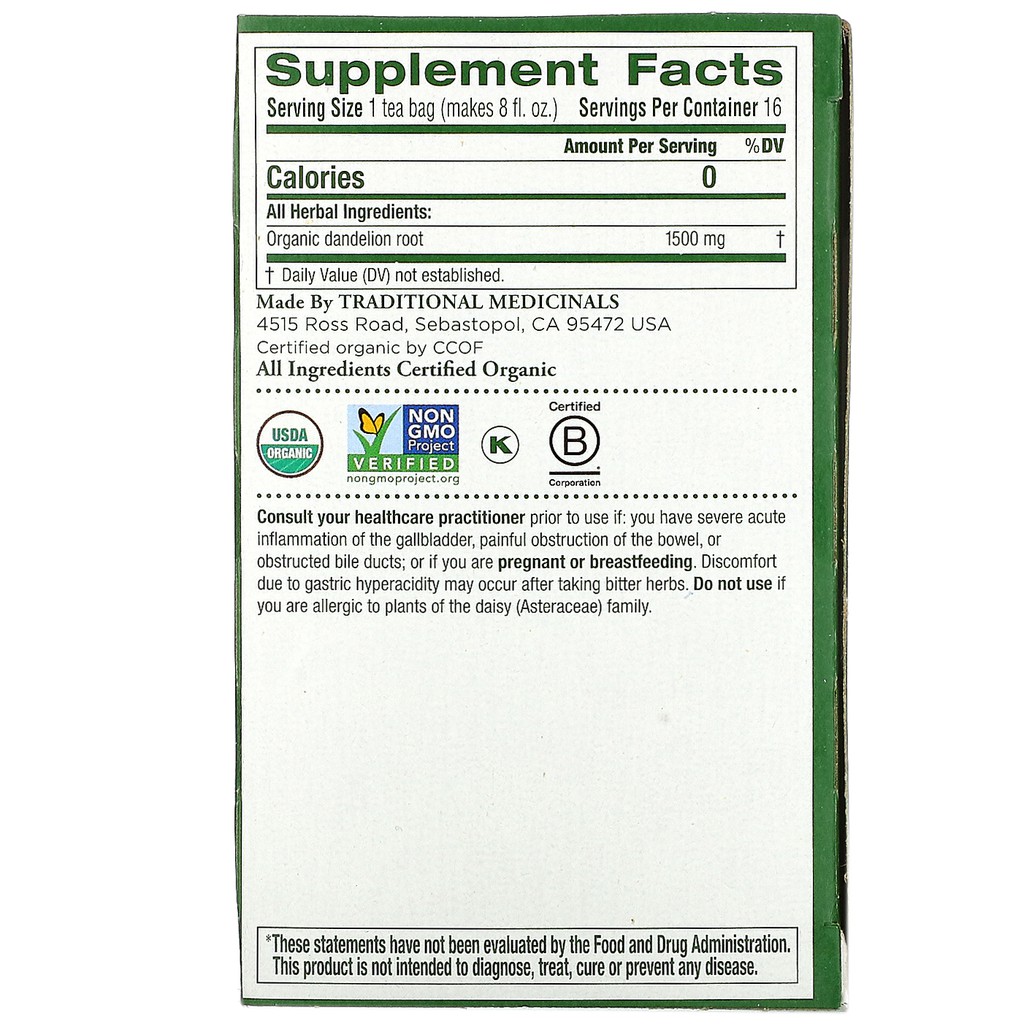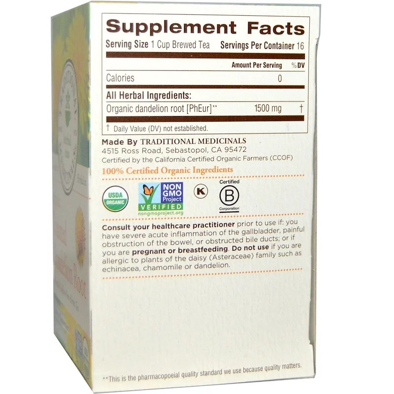 TM Organic Roasted Dandelion Root, Naturally Caffeine Free, 16 Tea Bags