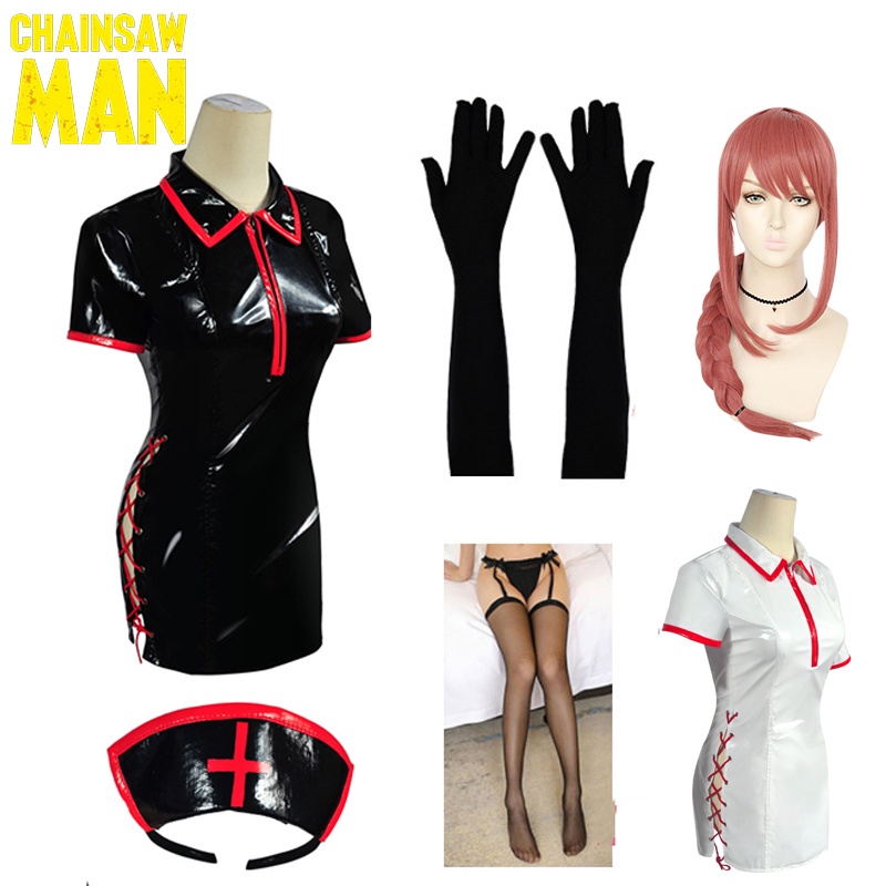 Halloween Chainsaw Man Makima Nurse Uniform Cosplay Costume PU Suit Wig Carnival