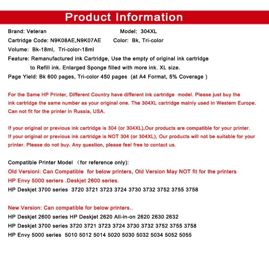 Veteran Ink Cartridge 304XL New Version for Hp304 Hp 304 Xl Deskjet Envy 2620 2630 2632 5030 5020 5032 3720 3730 5010 Printer
