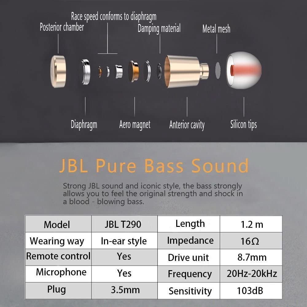 Jbl T290 Harman aluminum in-ear headphones with high-quality Bass sports style with popular buttons / mic