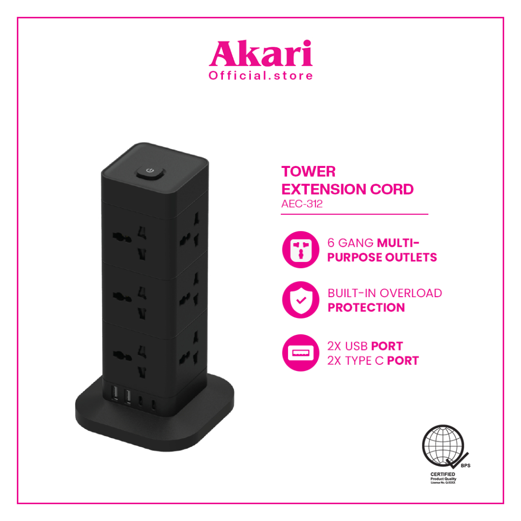 Akari Tower Extension Cord - Multi purpose outlet w/ Cover + Overload Protection (AEC-312)