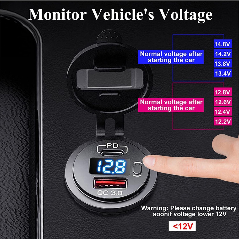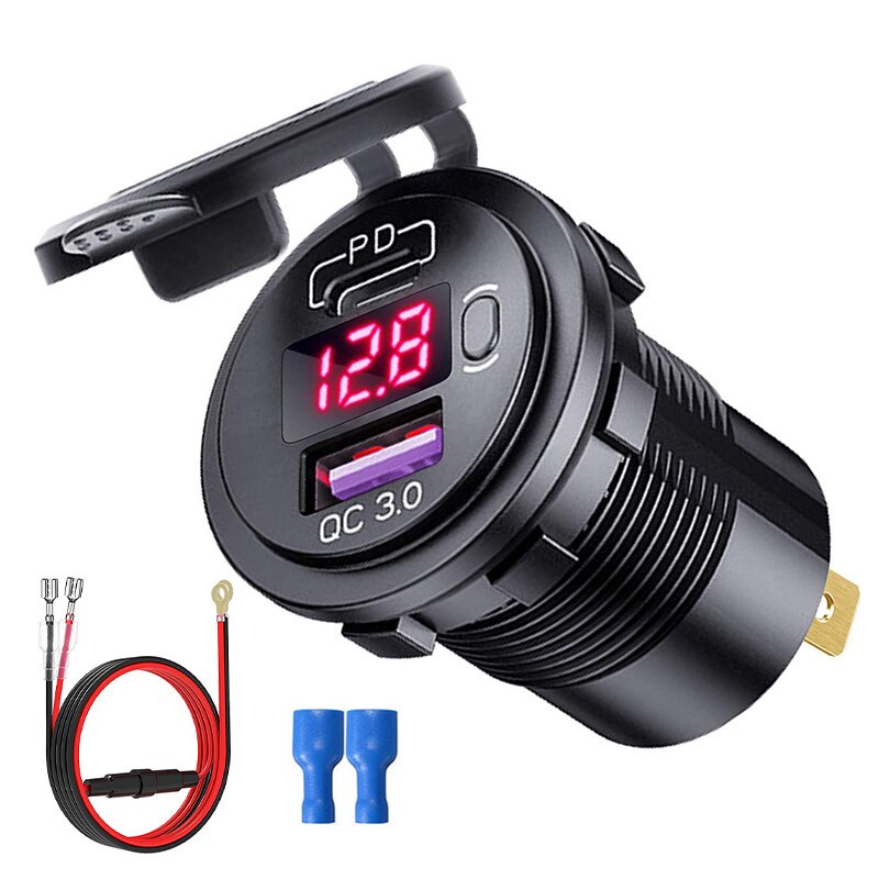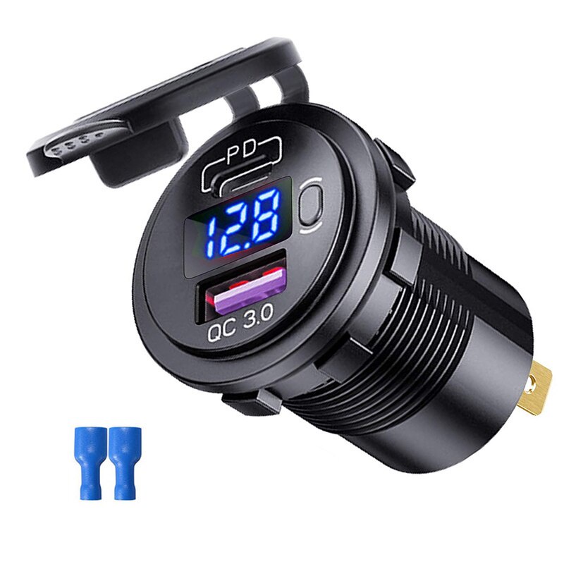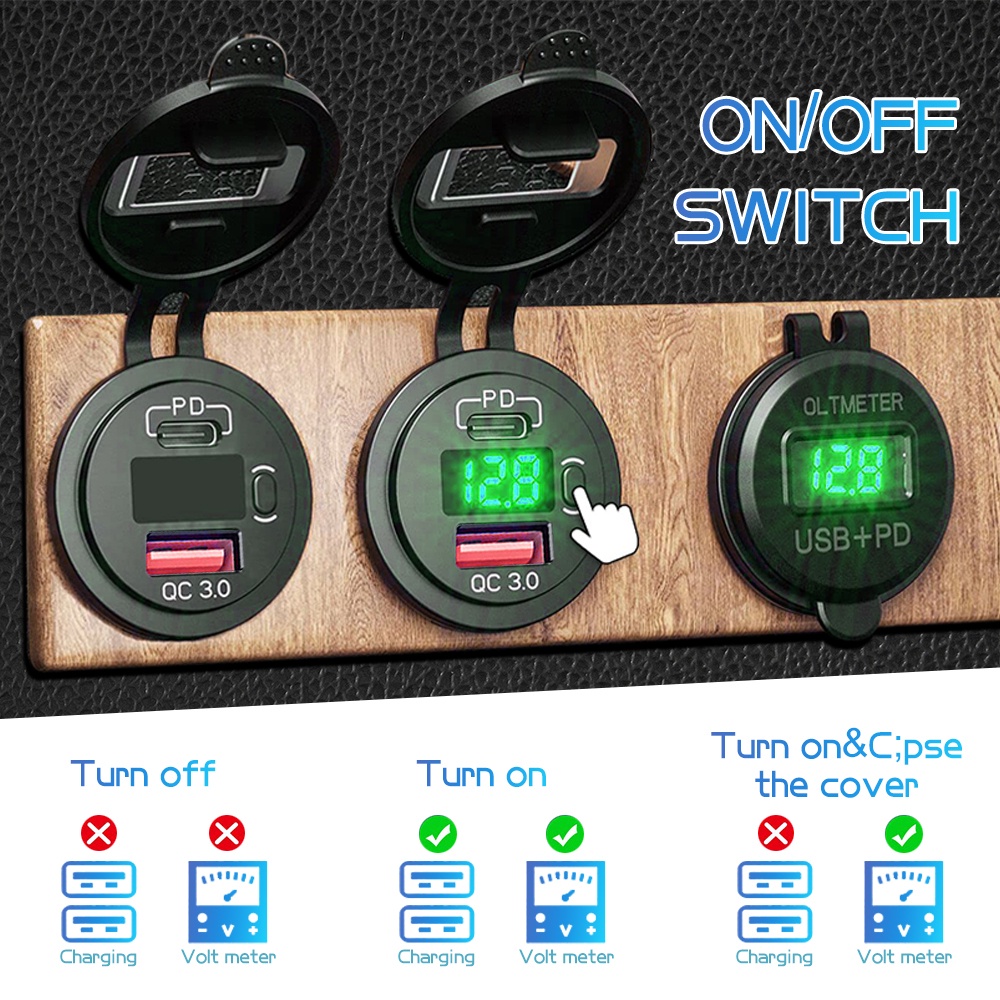 12V-24V USB Car Charger QC3.0 PD Type C with Switch Socket for 12V/24V Vehicles Boat Motorcycle SUV Bus Truck Caravan Marine