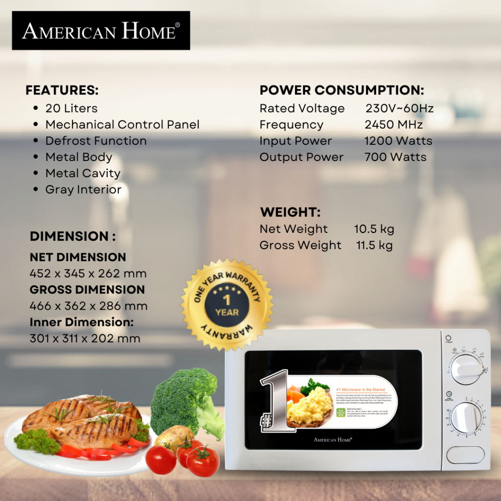 American Home AMW-22W Microwave Oven 20L Mechanical Control Color White Gray Interior