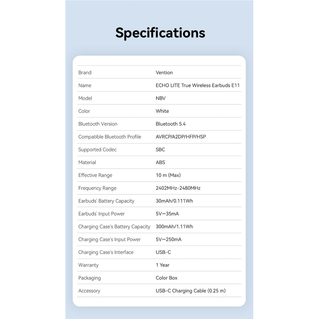 Vention ECHO LITE E11 Bluetooth Earphones TWS Bluetooth 5.4 HiFi True Wireless Headphones Stereo Sports Earbuds With Mic