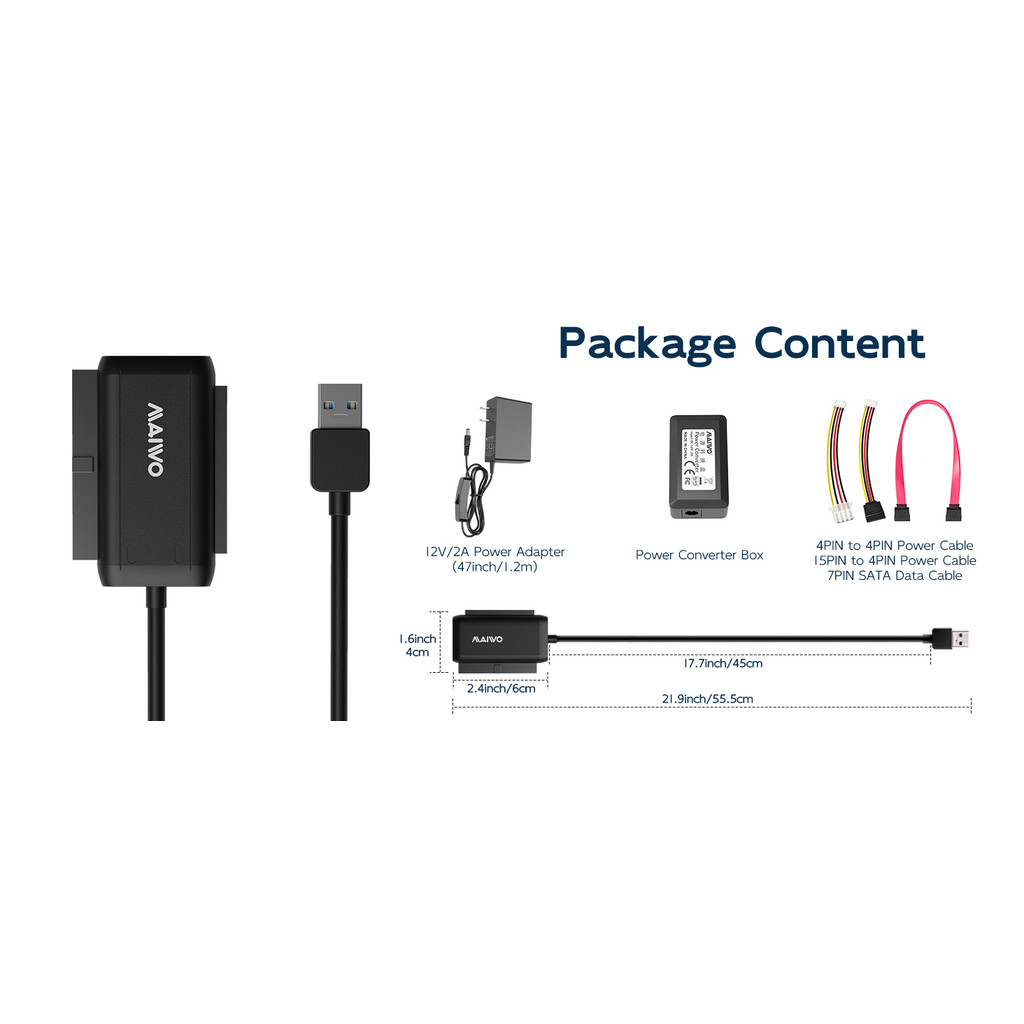 MAIWO SATA IDE to USB 3.0 Adapter Cable, External Hard Drive Ultra Recovery Converter for Universal 2.5/3.5 Inch IDE/SATA HDD/SSD 12V/2A Power Adapter