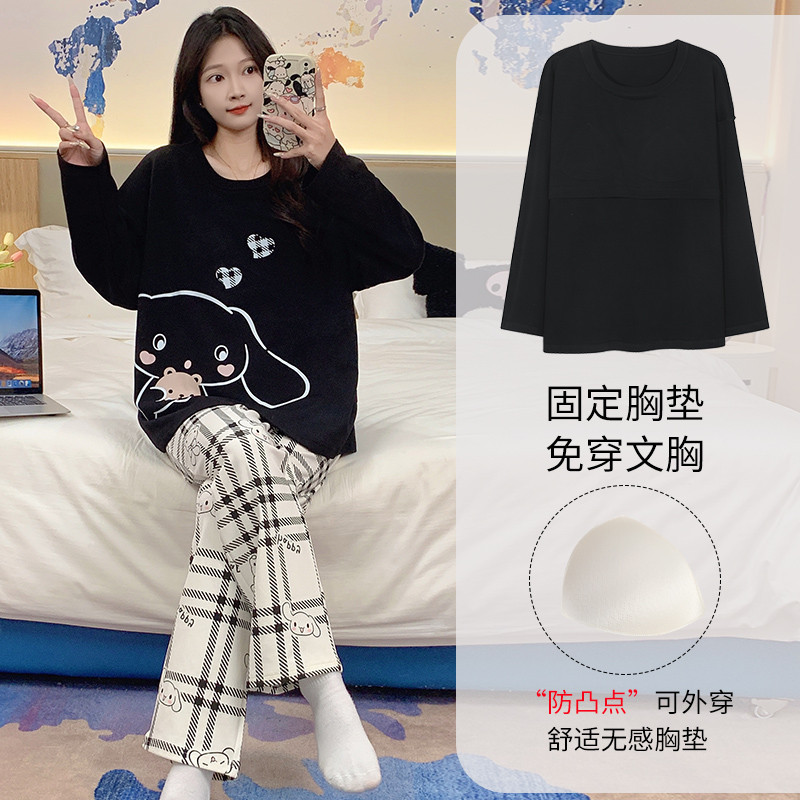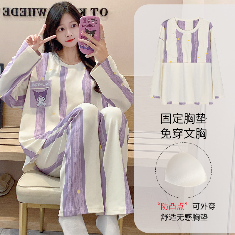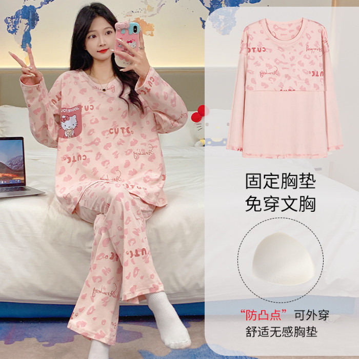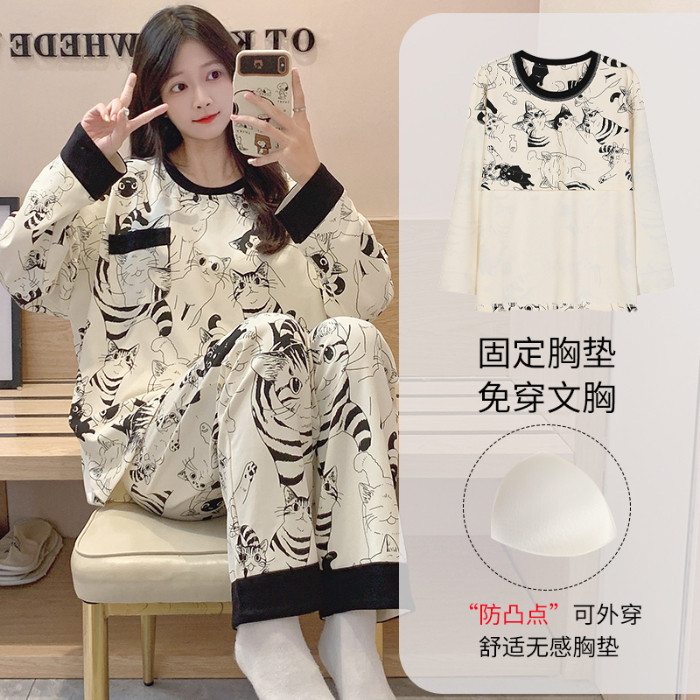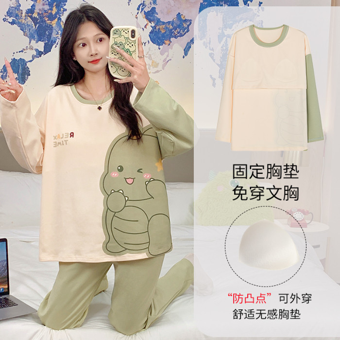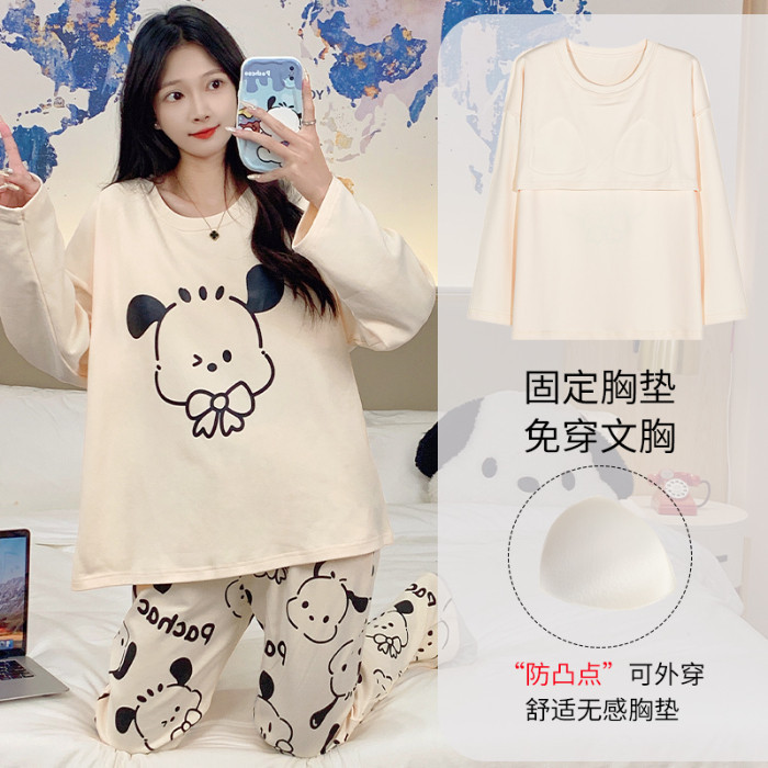 Terno Pajama for Woman Padded Pajamas Cotton Autumn Long Sleeves Sleepwear Women Cute Cartoon with chest pad Home wear Set