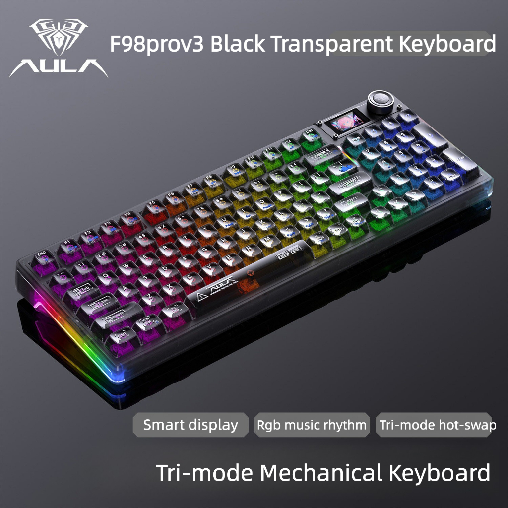Ready stock Aula F98pro V3 three-mode transparent RGB mechanical keyboard customized screen display Gasket structure hot swappable RGB