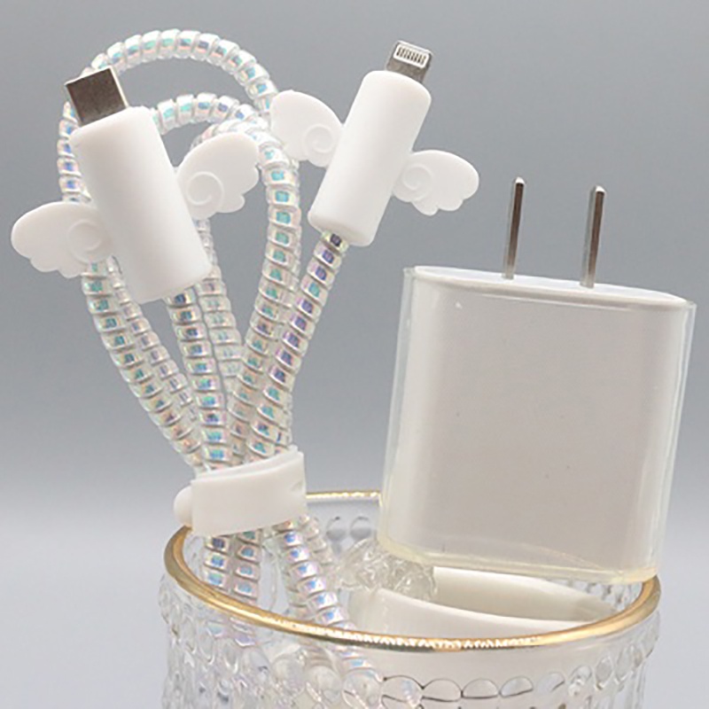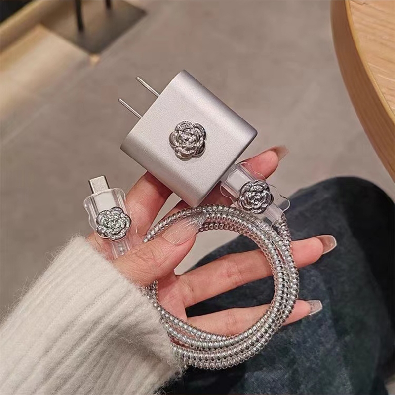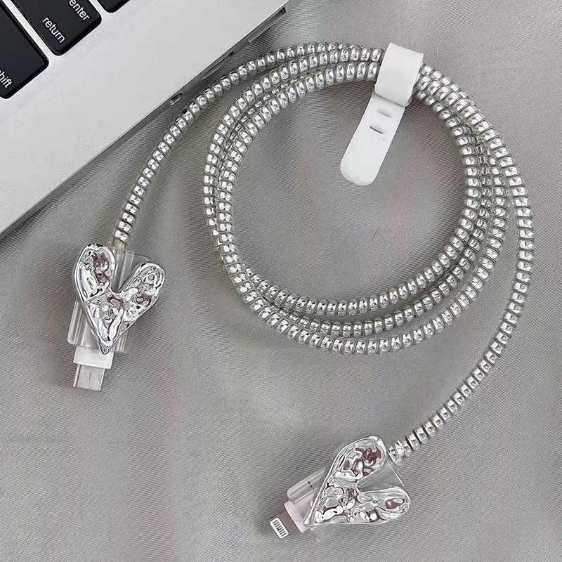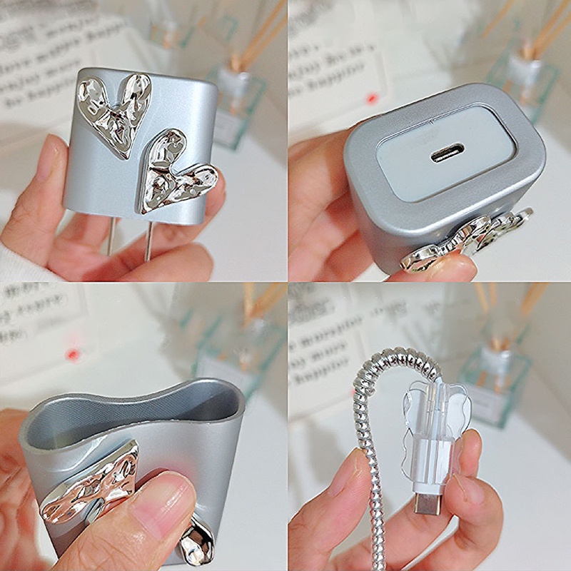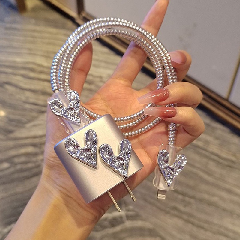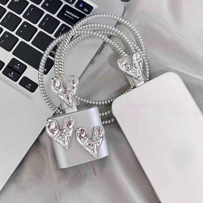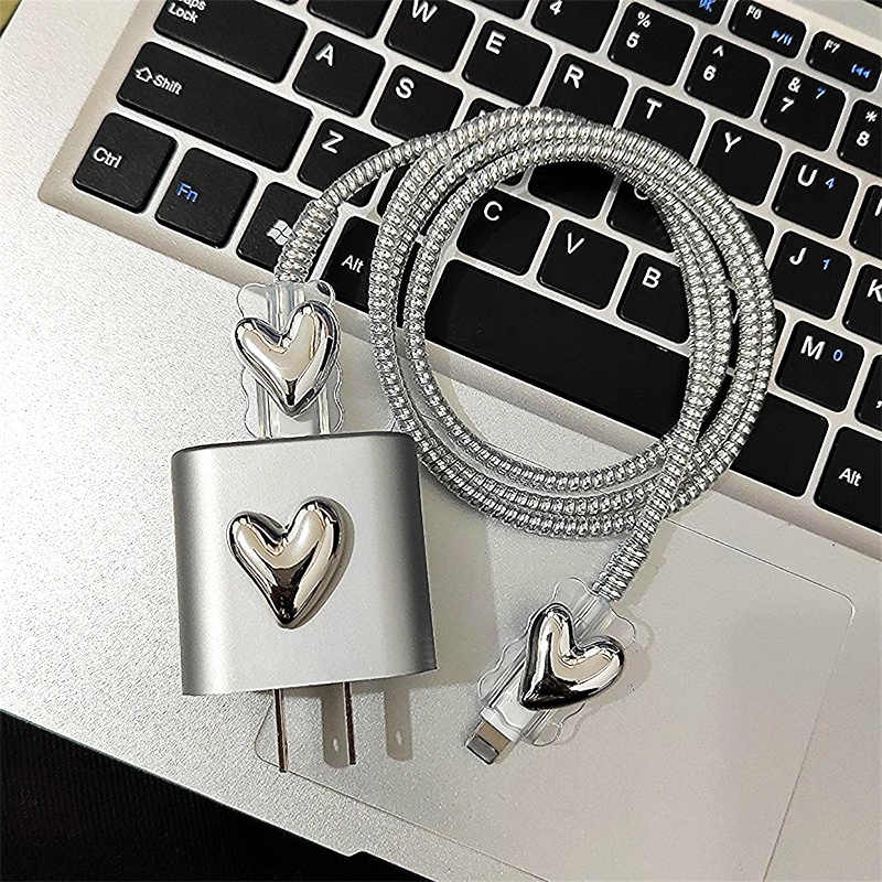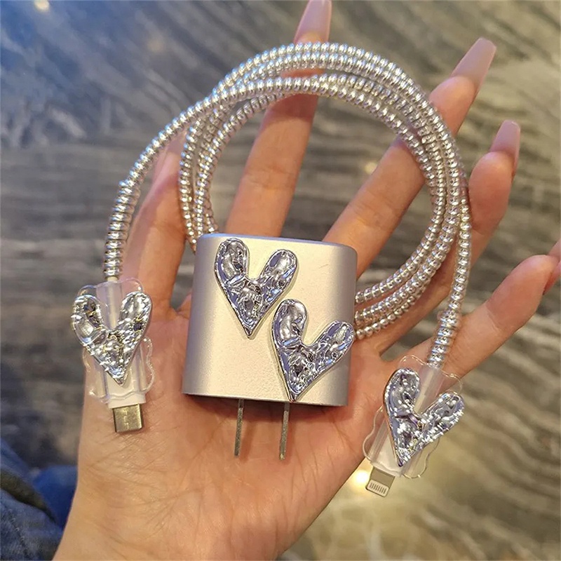 INS style 3D Silver Heart Charger Protector anti-breaking cable protector charger case for iP 14 pro max Charger cover for iP 20w
