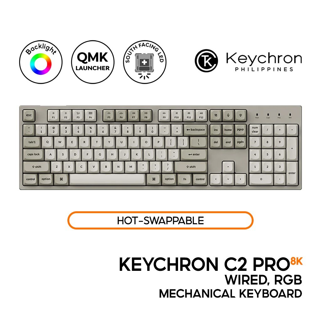 Keychron C2 Pro 8K QMK Mechanical Keyboard, Full, Wired, RGB LED, QMK/Launcher, Hotswap
