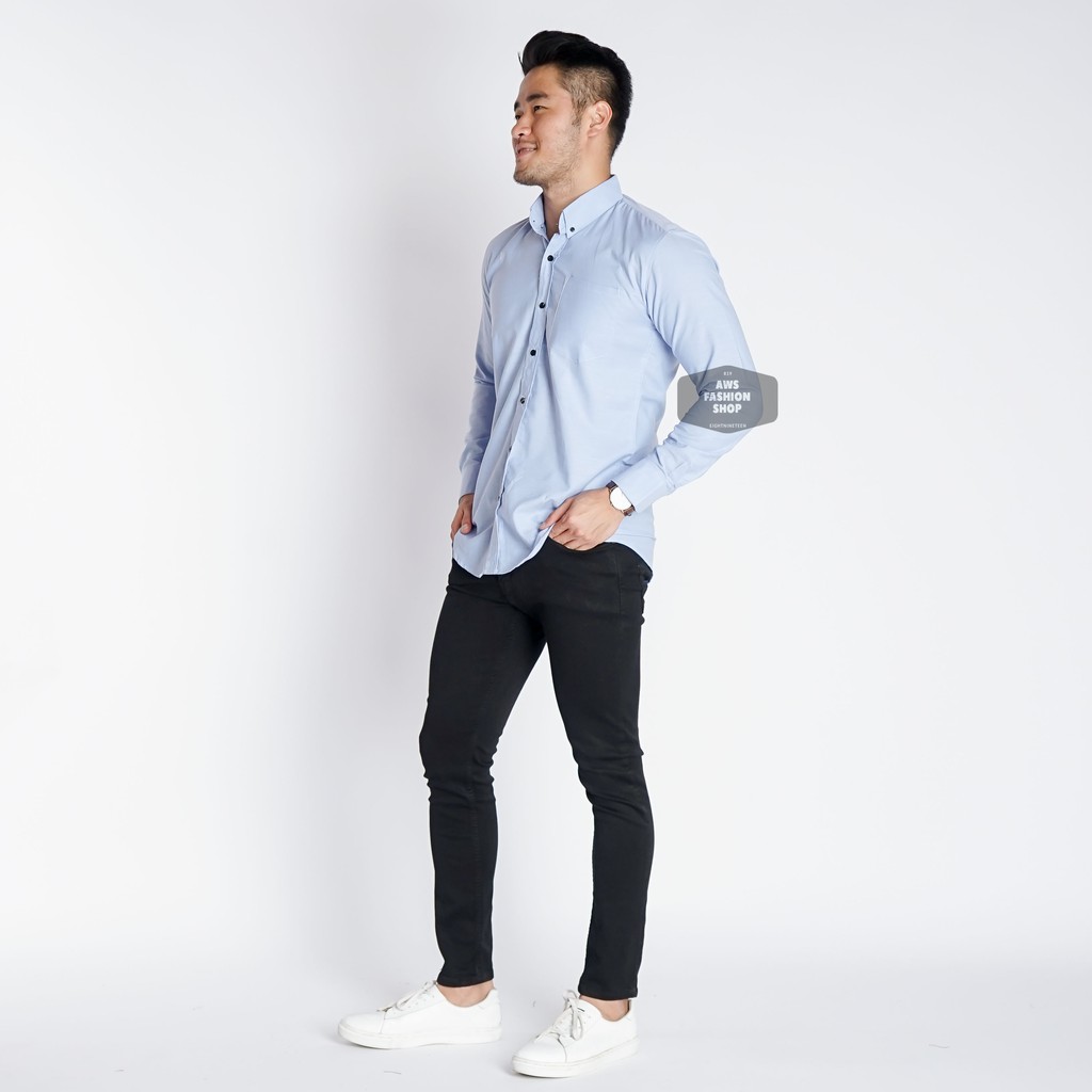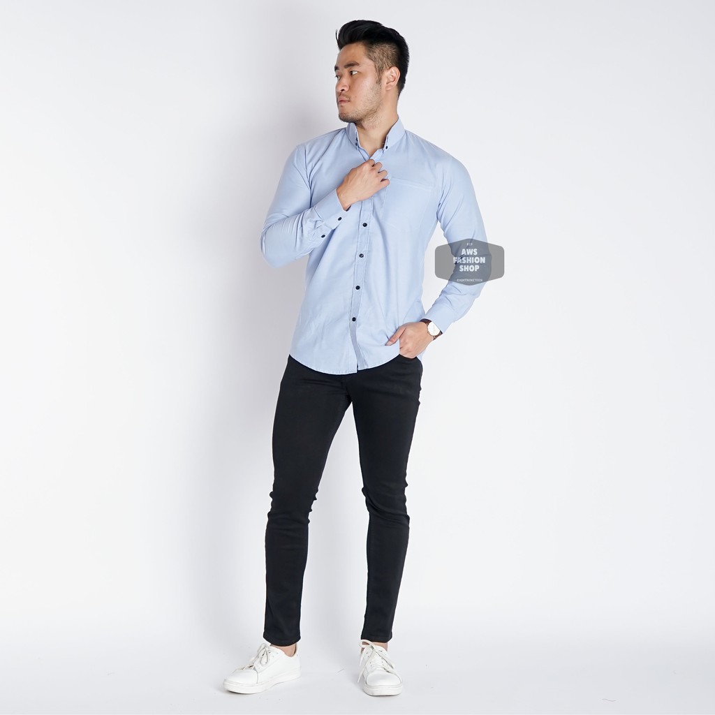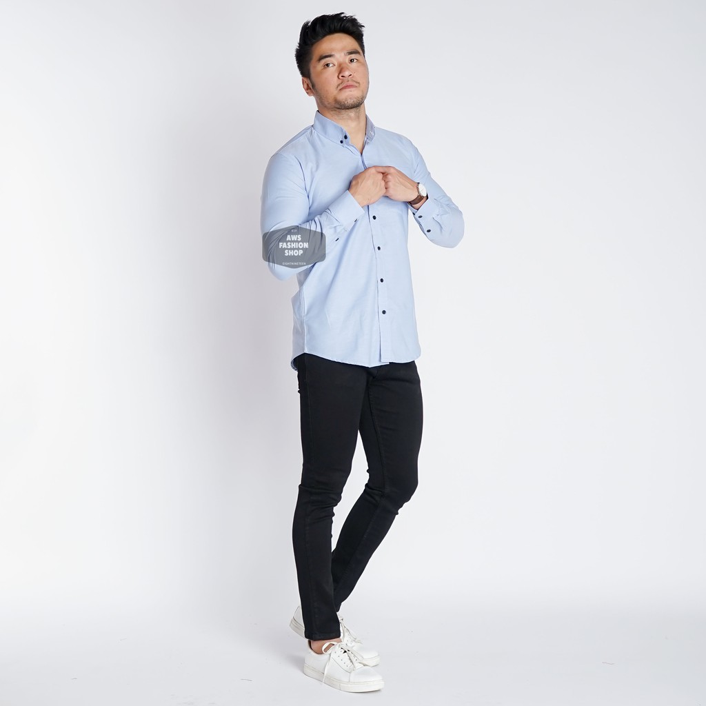 KEMEJA Men's Plain Oxford Long Sleeve Shirt Light Blue Soft Blue Casual Slimfit 3371
