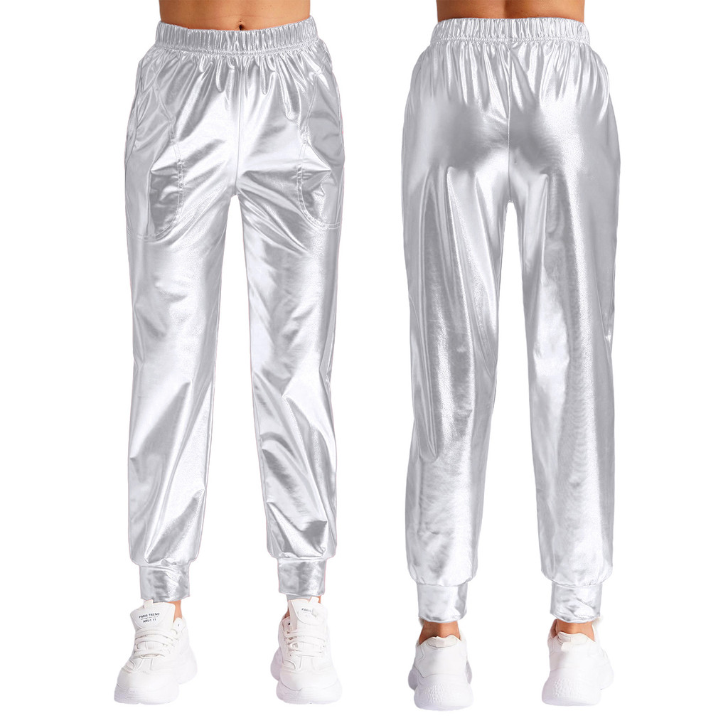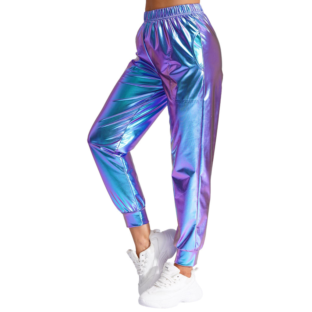 inhzoy Women Shiny Metallic Pants High Waist Elastic Waist Sport Pants Metallic Sheen Modern Dance Pants Loose Pants