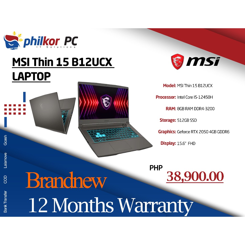 MSI Thin 15 B12UCX Brandnew Gaming Laptop, Intel Core i5-12450H 8GB RAM 512G ssd Gforce RTX 2050 4GB