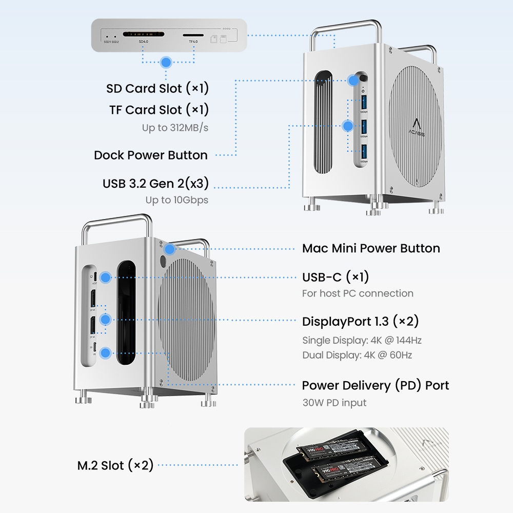 ACASIS Mac Mini M4 Workstation Single SSD Slot 40Gpbs 8-IN-1 Docking Station USB-C Hub With 2xDP, SD/TF 3.0, 3xUSB-A 3.2, NVME M.2 SSD Enclosure Compatible with Thunderbolt 4/3