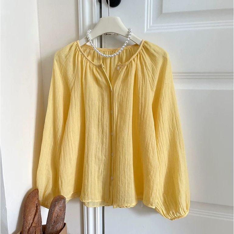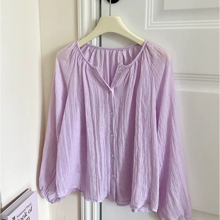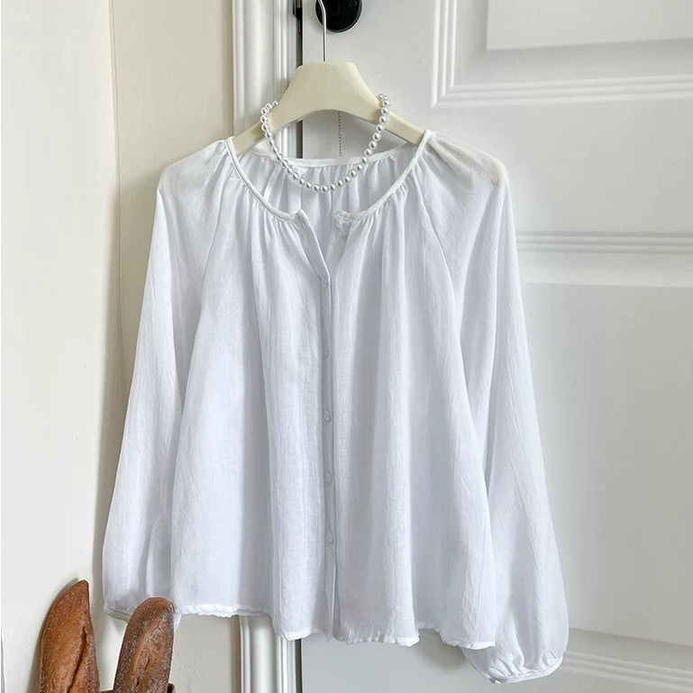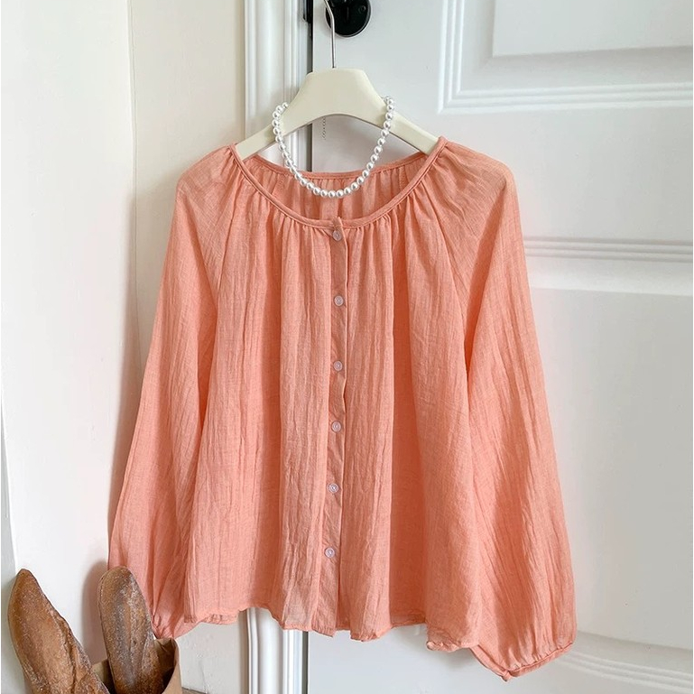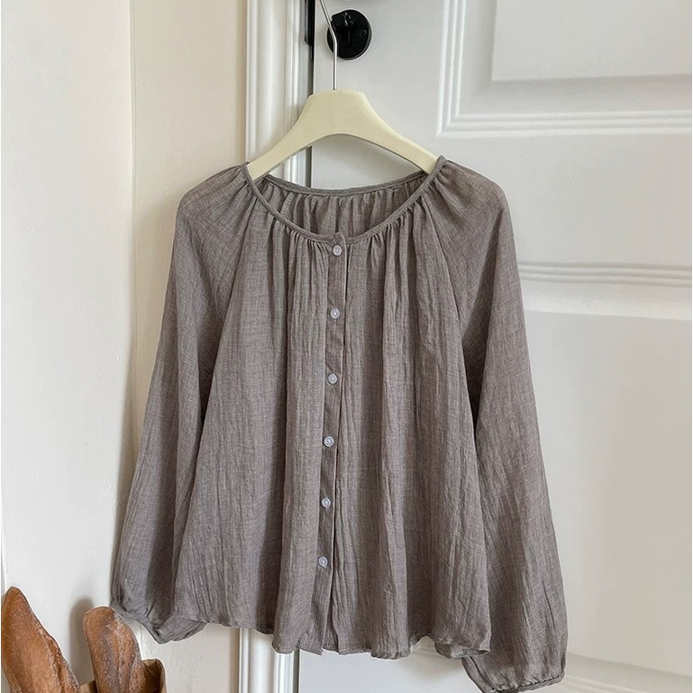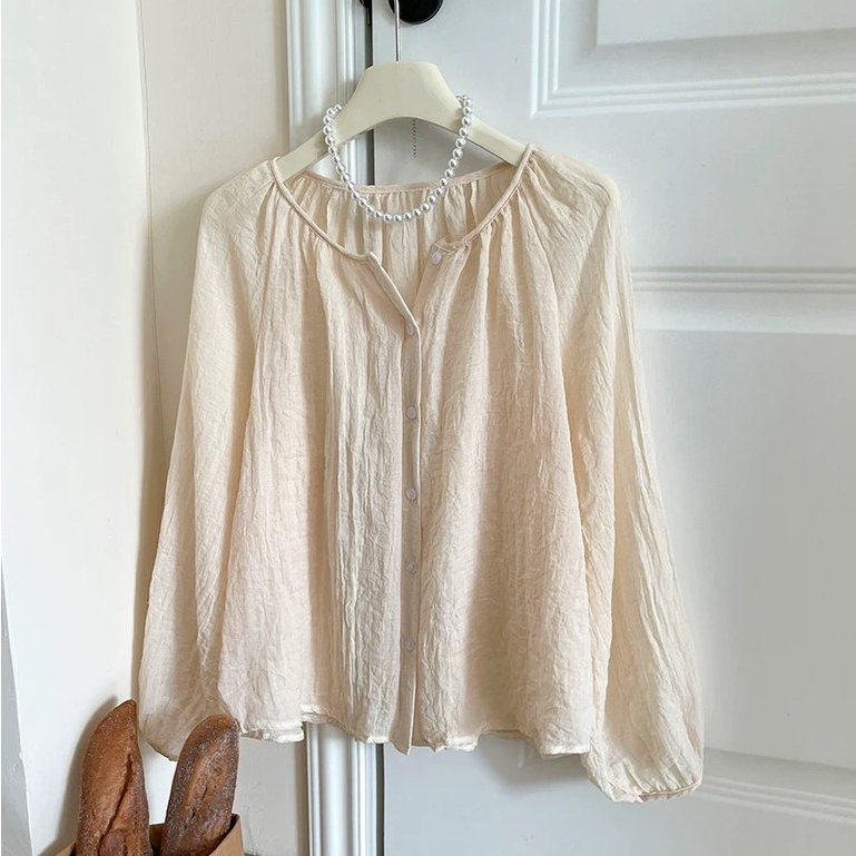 Summer balloon sleeve retro resort style cotton linen sunscreen shirt women