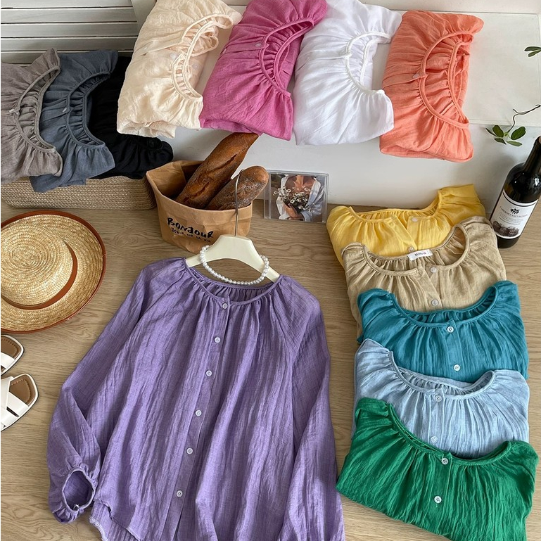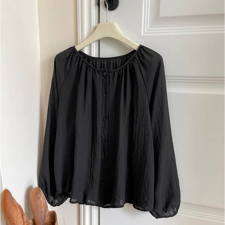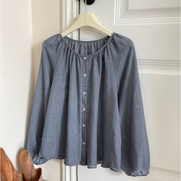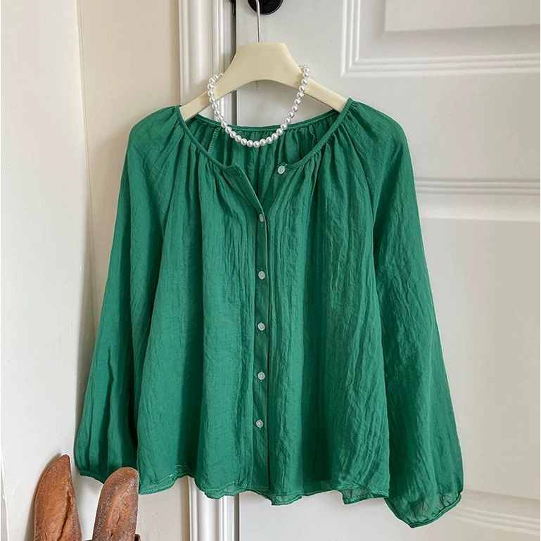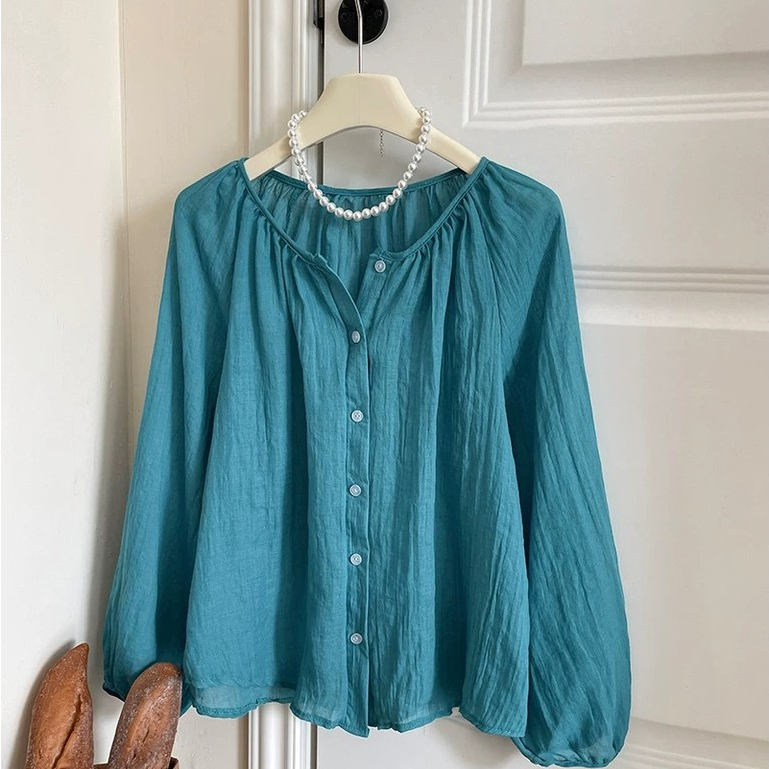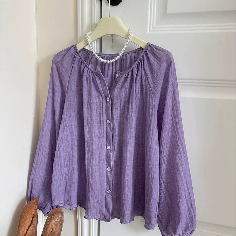 Summer balloon sleeve retro resort style cotton linen sunscreen shirt women