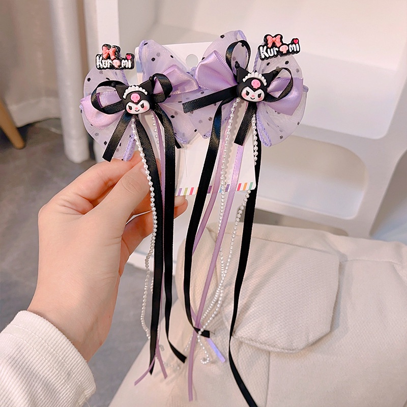 Purple Kuromi Hair Accessories Girls Sweet Cute Purple Black Bow Hair Clip Side Clip Little Girl Long Ribbon Top Clip Duckbill Clip Children Princess Head Accessories