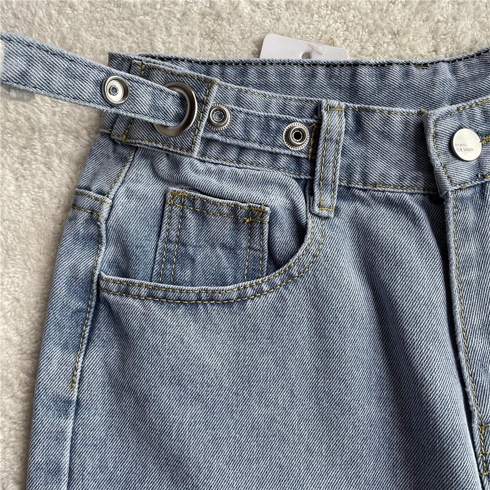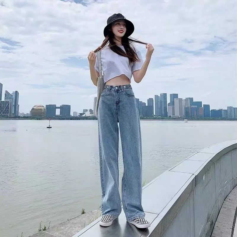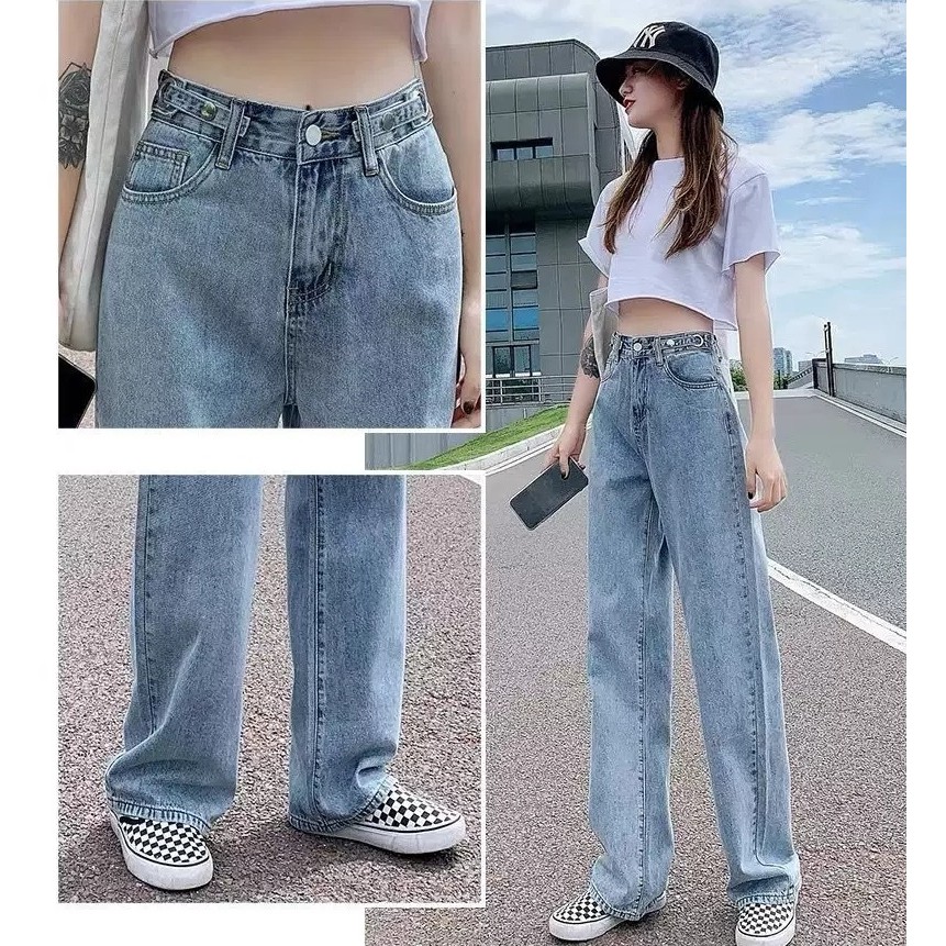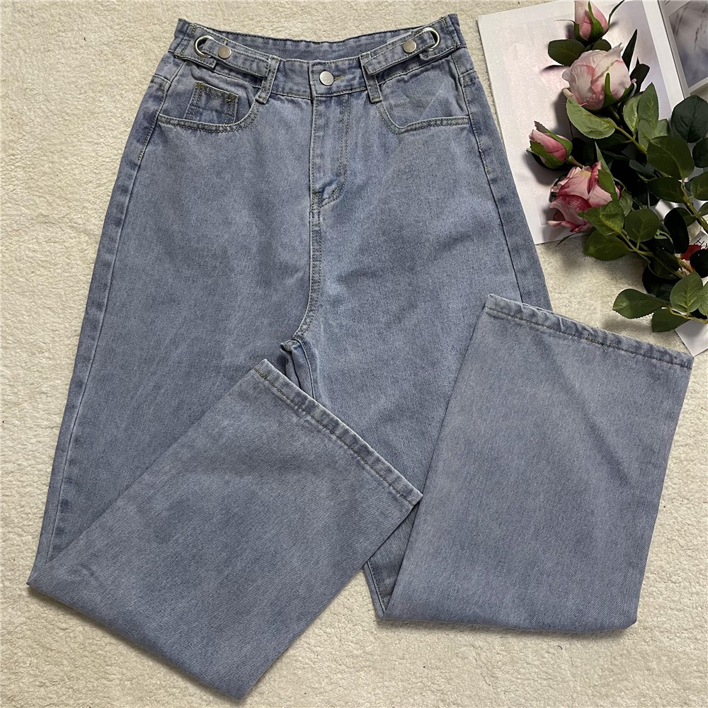 High waist Loose mopping jeans for women Korean style adjustment buckle looks thin wide-leg pants